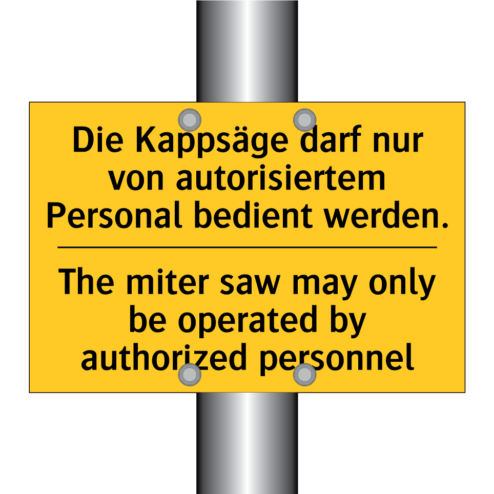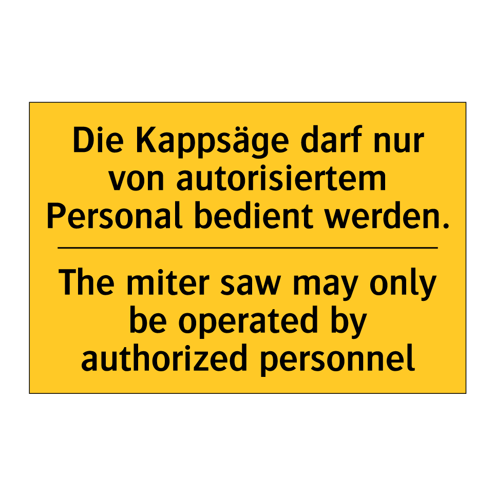 Zweisprachiges Warnschild mit deutschem Text Die Kappsäge darf nur von autorisiertem Personal bedient werden. und englischem Text The miter saw may only be operated by authorized personnel