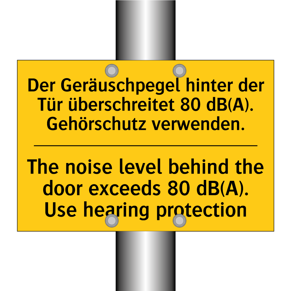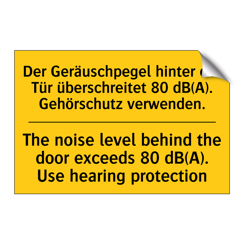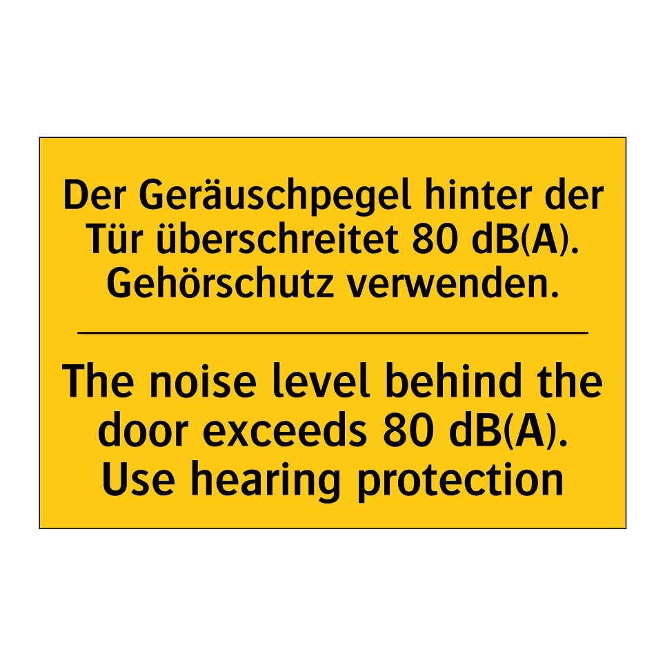 Zweisprachiges Warnschild mit deutschem Text Der Geräuschpegel hinter der Tür überschreitet 80 dB(A). Gehörschutz verwenden. und englischem Text The noise level behind the door exceeds 80 dB(A). Use hearing protection