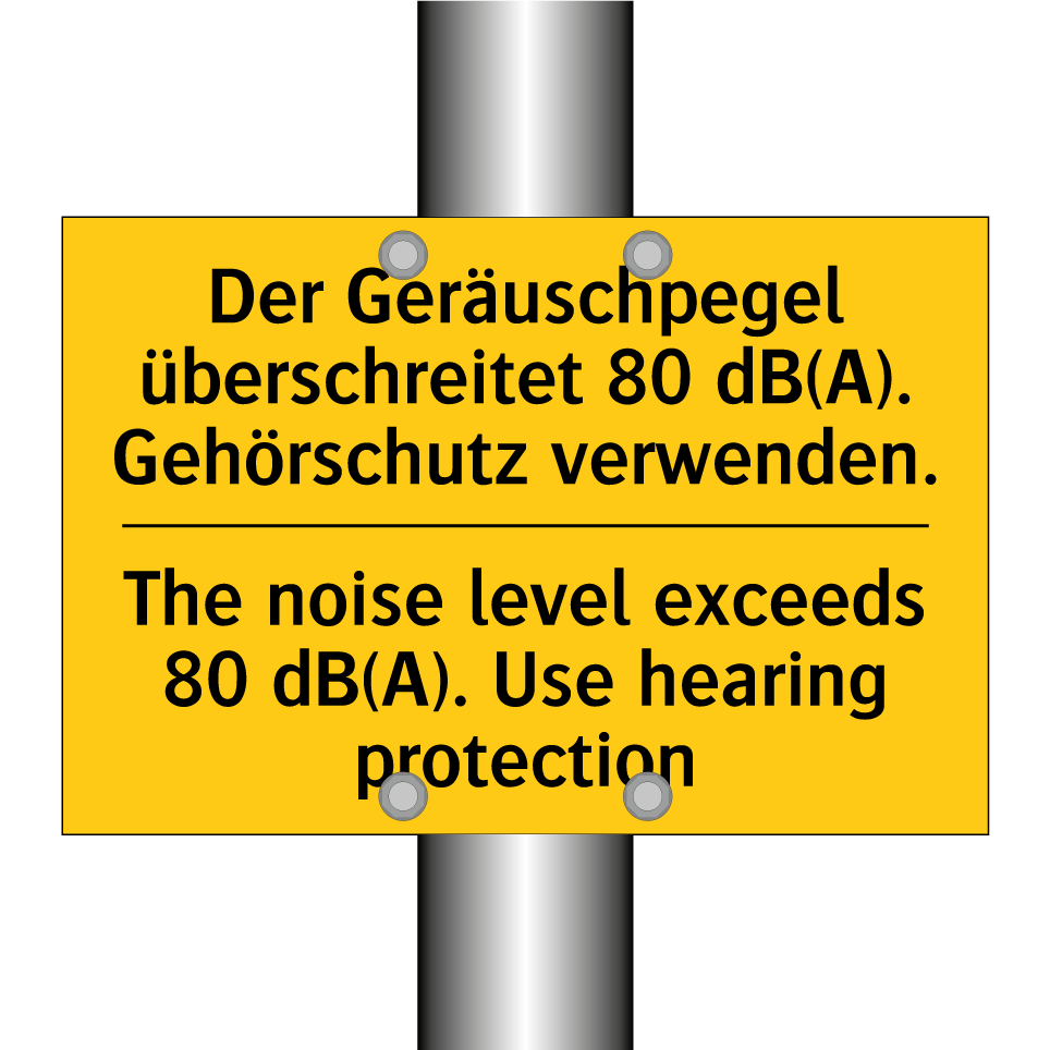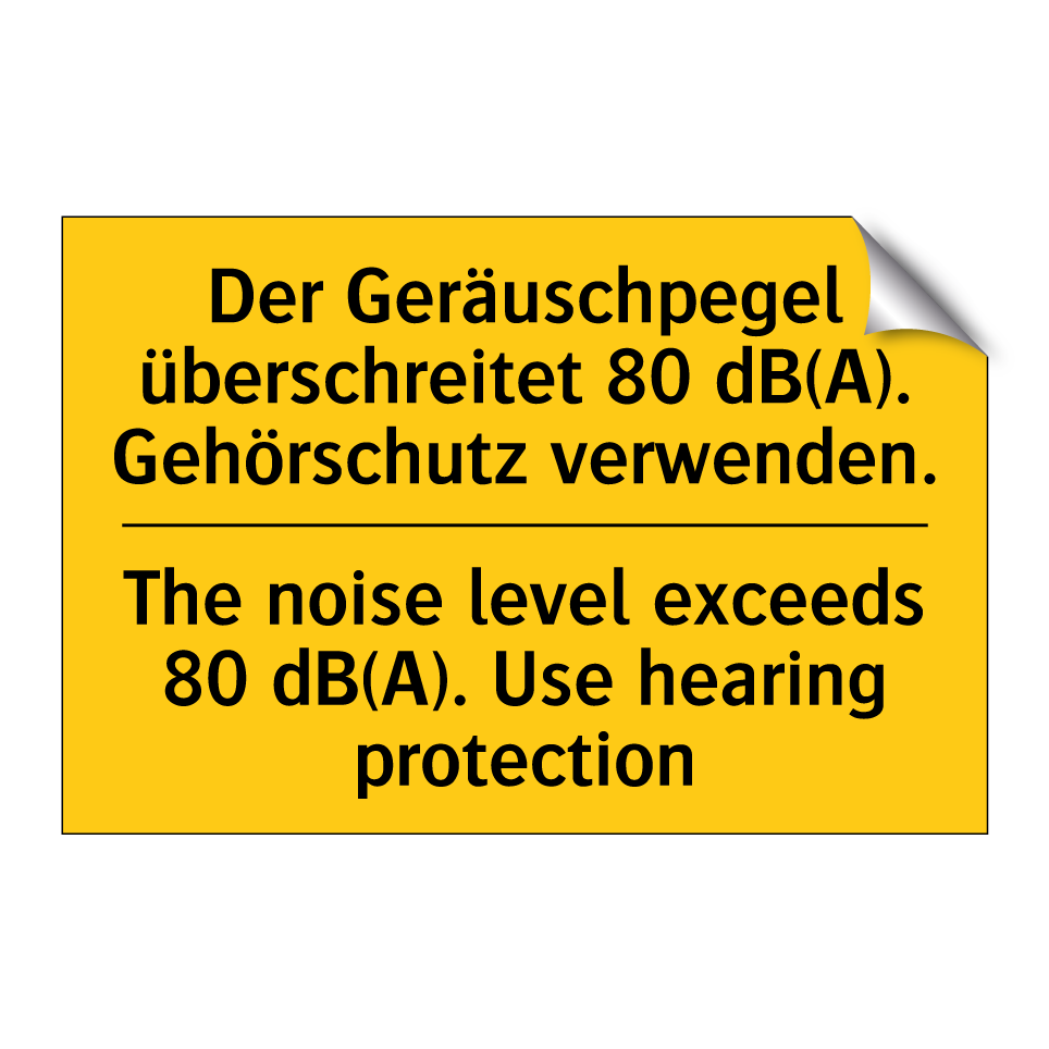 Zweisprachiges Warnschild mit deutschem Text Der Geräuschpegel überschreitet 80 dB(A). Gehörschutz verwenden. und englischem Text The noise level exceeds 80 dB(A). Use hearing protection