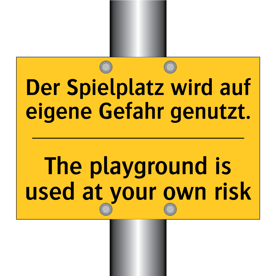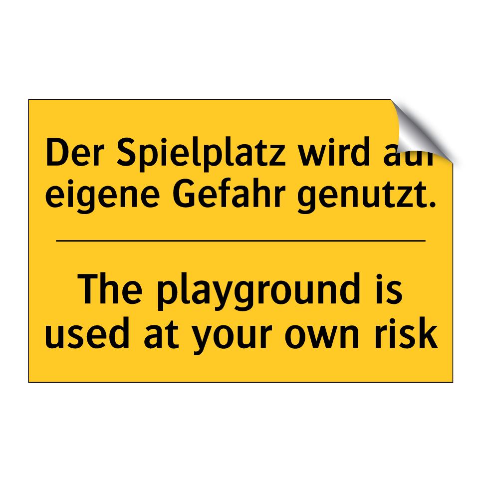 Zweisprachiges Warnschild mit deutschem Text Der Spielplatz wird auf eigene Gefahr genutzt. und englischem Text The playground is used at your own risk