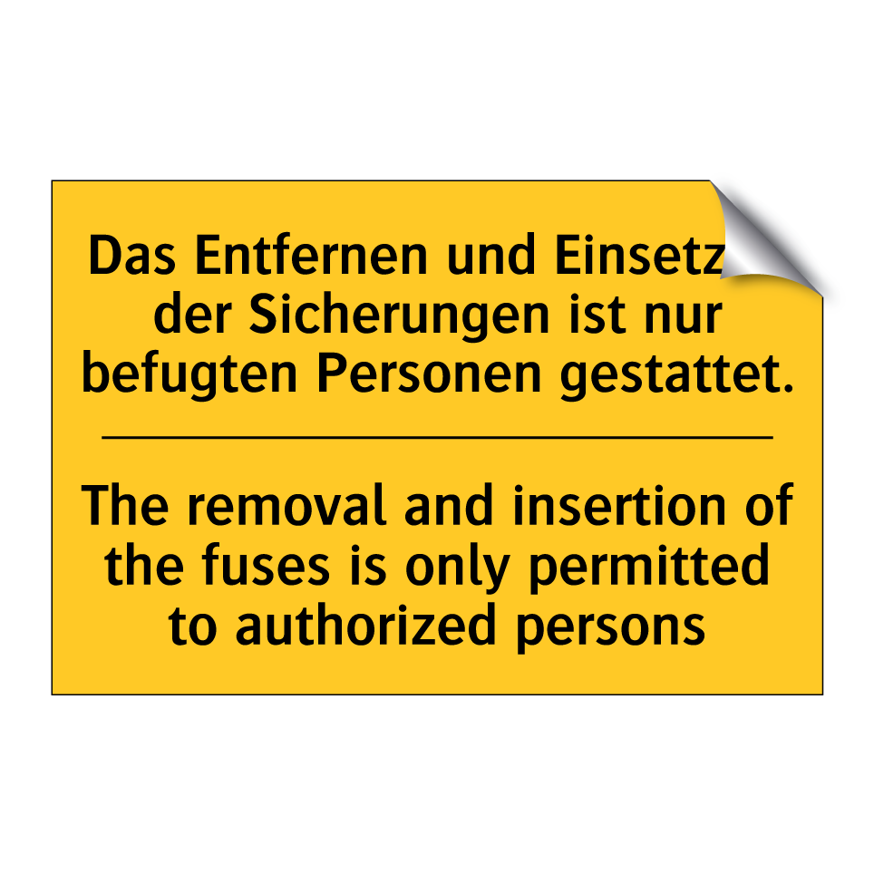 Zweisprachiges Warnschild mit deutschem Text Das Entfernen und Einsetzen der Sicherungen ist nur befugten Personen gestattet. und englischem Text The removal and insertion of the fuses is only permitted to authorized persons