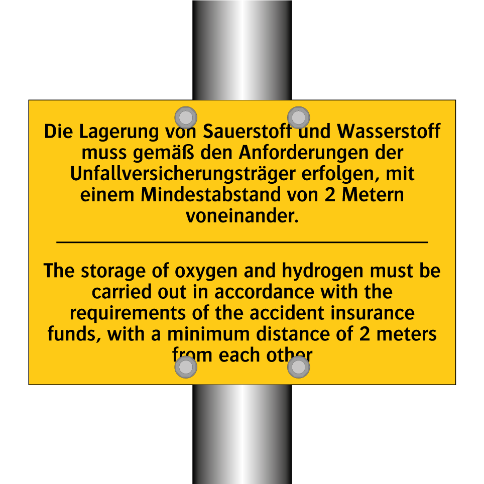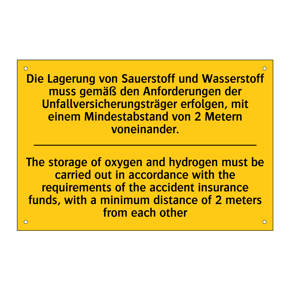 Zweisprachiges Warnschild mit deutschem Text Die Lagerung von Sauerstoff und Wasserstoff muss gemäß den Anforderungen der Unfallversicherungsträger erfolgen, mit einem Mindestabstand von 2 Metern voneinander. und englischem Text The storage of oxygen and hydrogen must be carried out in accordance with the requirements of the accident insurance funds, with a minimum distance of 2 meters from each other