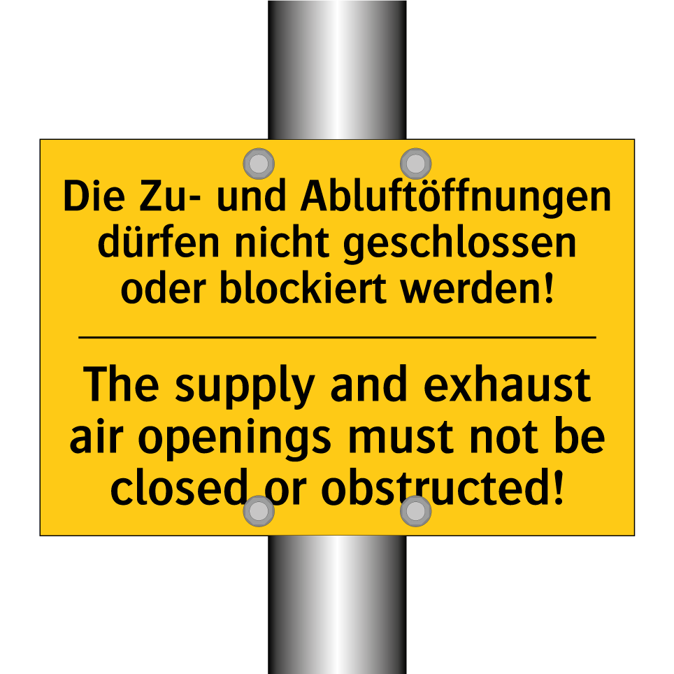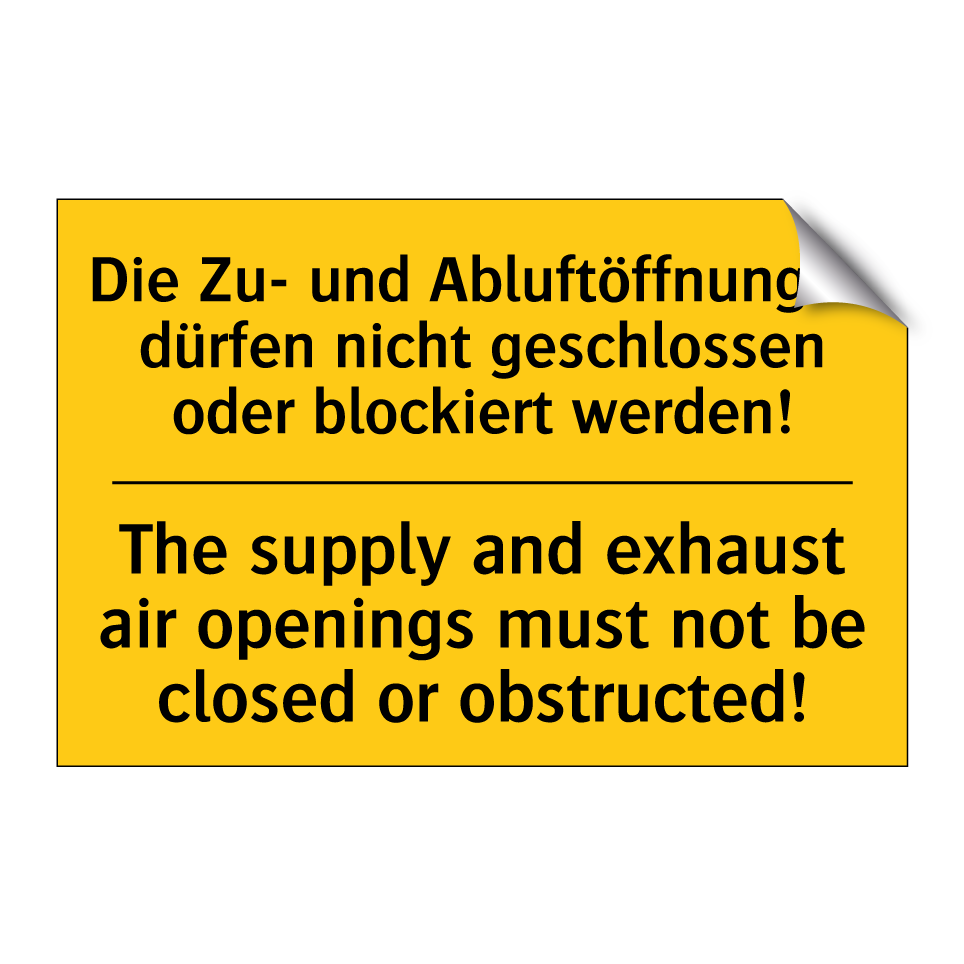 Zweisprachiges Warnschild mit deutschem Text Die Zu- und Abluftöffnungen dürfen nicht geschlossen oder blockiert werden! und englischem Text The supply and exhaust air openings must not be closed or obstructed!
