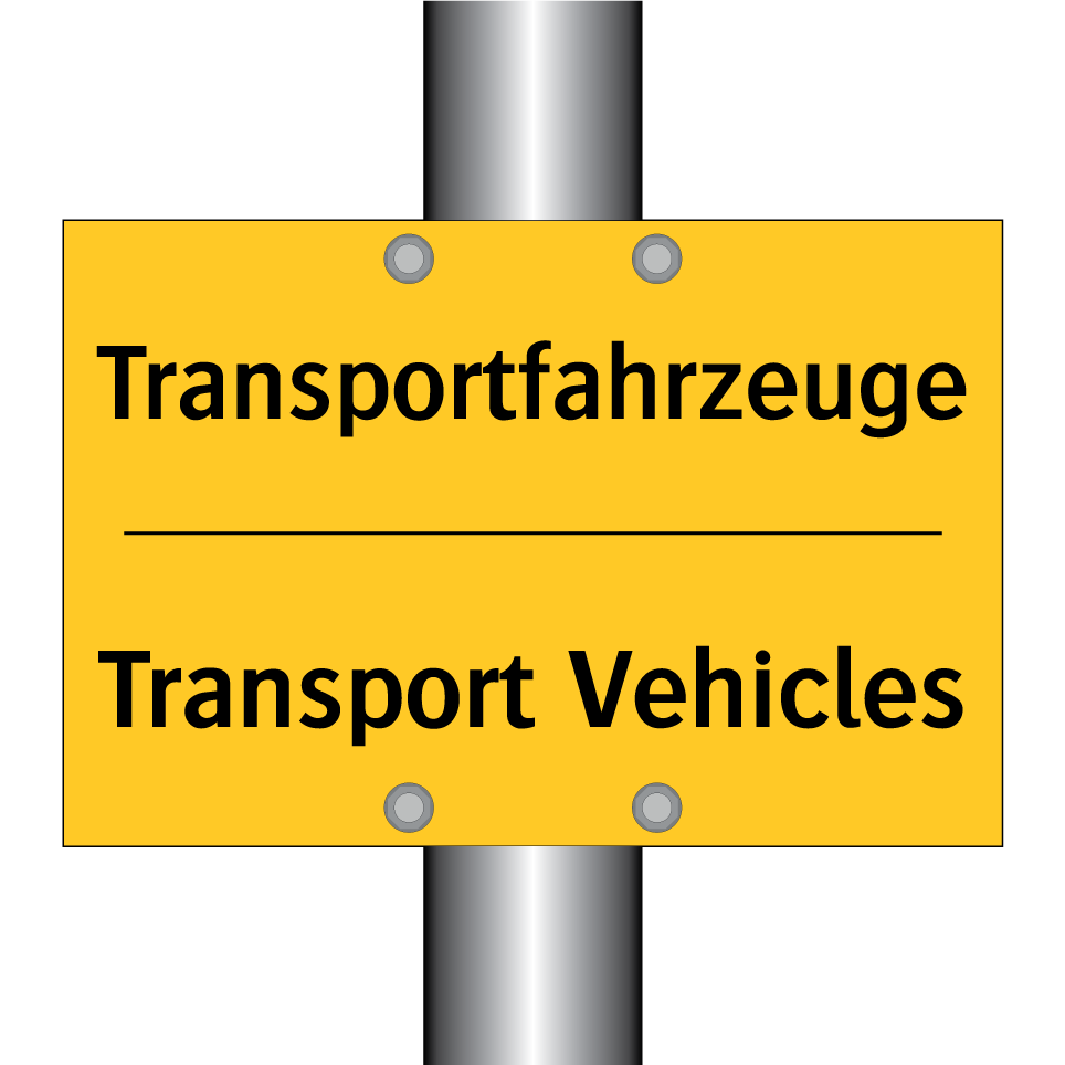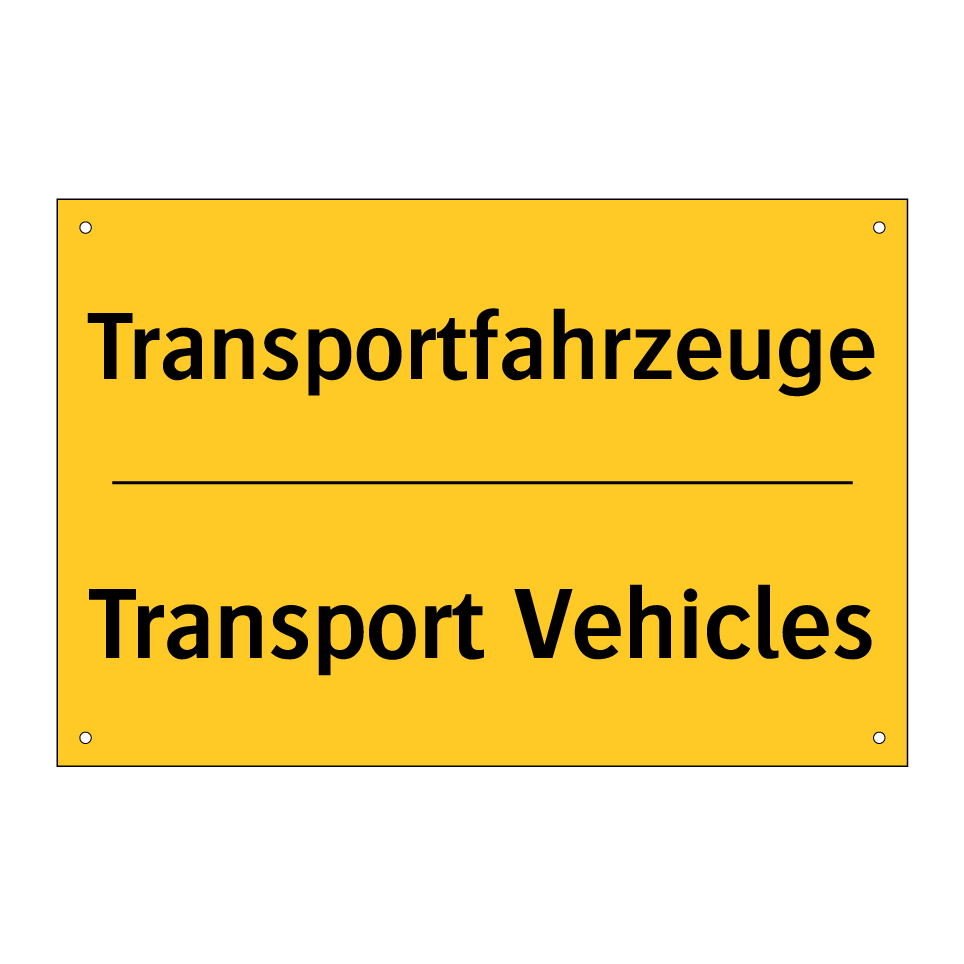 Zweisprachiges Warnschild mit deutschem Text Transportfahrzeuge und englischem Text Transport Vehicles