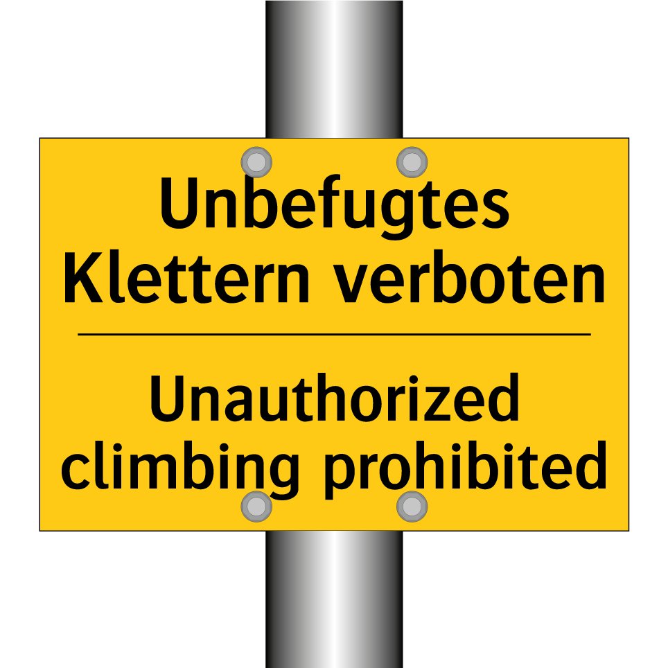 Zweisprachiges Warnschild mit deutschem Text Unbefugtes Klettern verboten und englischem Text Unauthorized climbing prohibited