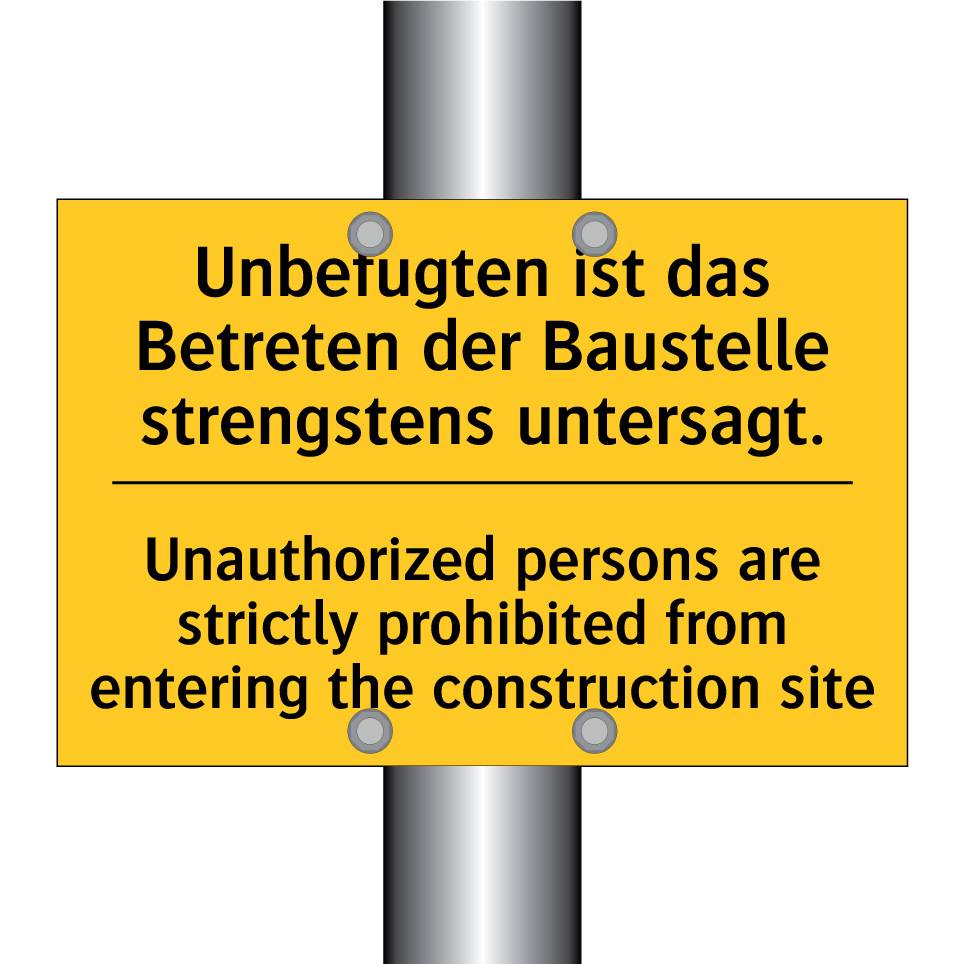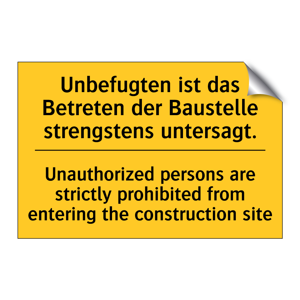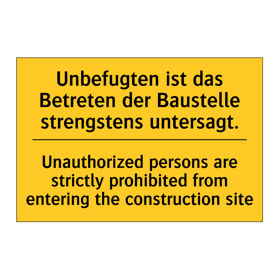 Zweisprachiges Warnschild mit deutschem Text Unbefugten ist das Betreten der Baustelle strengstens untersagt. und englischem Text Unauthorized persons are strictly prohibited from entering the construction site