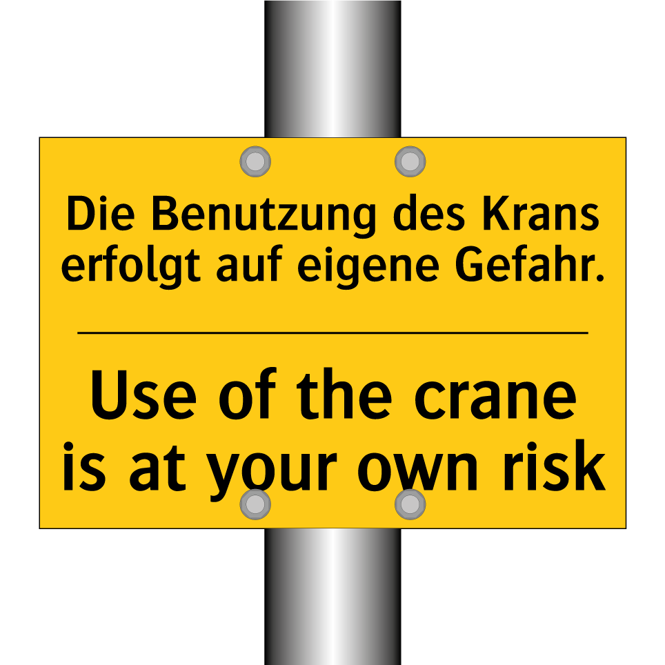 Zweisprachiges Warnschild mit deutschem Text Die Benutzung des Krans erfolgt auf eigene Gefahr. und englischem Text Use of the crane is at your own risk