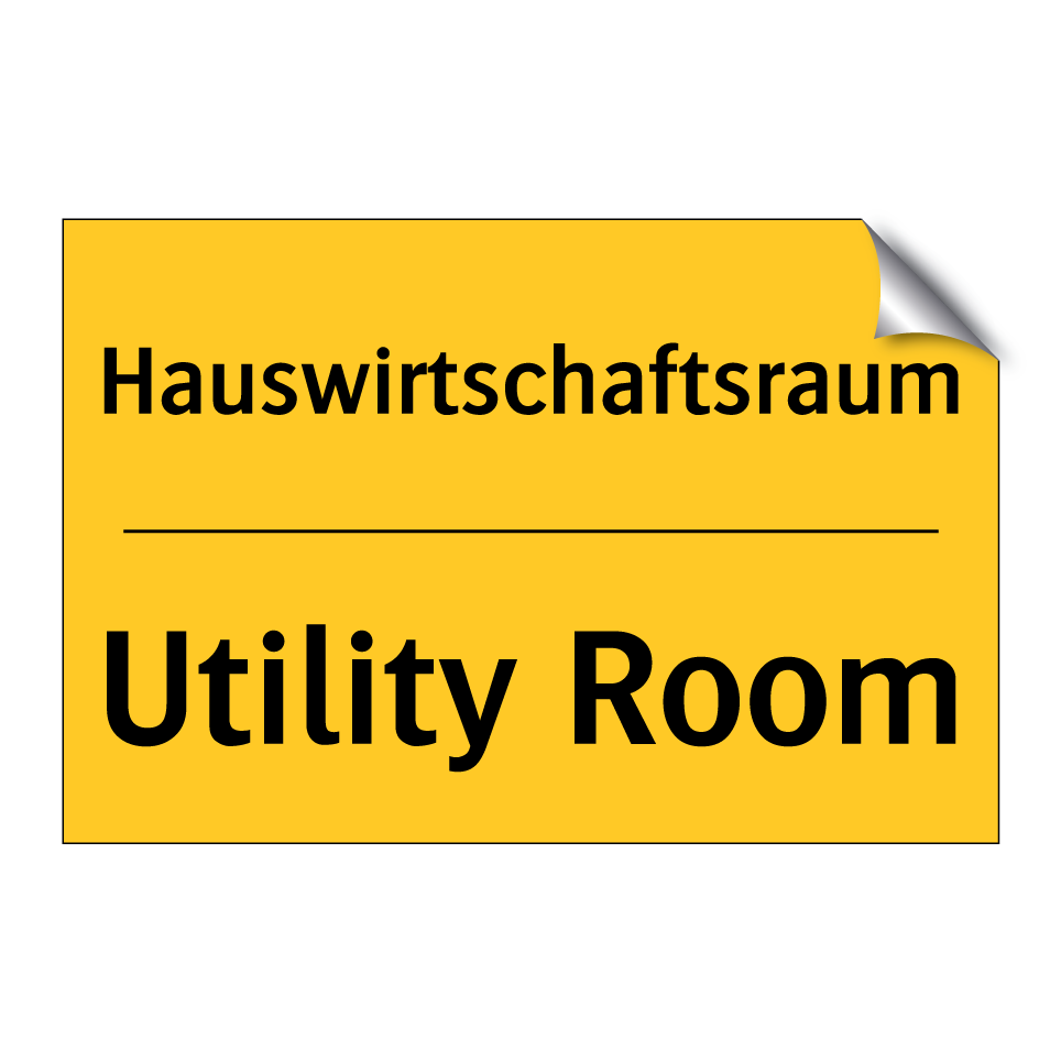 Zweisprachiges Warnschild mit deutschem Text Hauswirtschaftsraum und englischem Text Utility Room