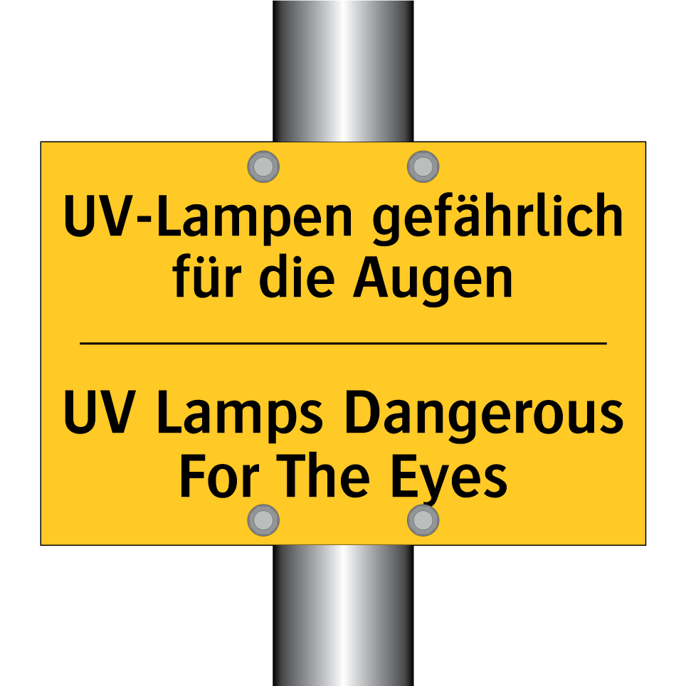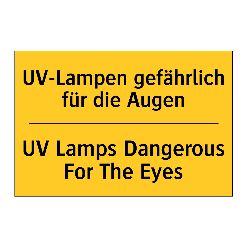 Zweisprachiges Warnschild mit deutschem Text UV-Lampen gefährlich für die Augen und englischem Text UV Lamps Dangerous For The Eyes