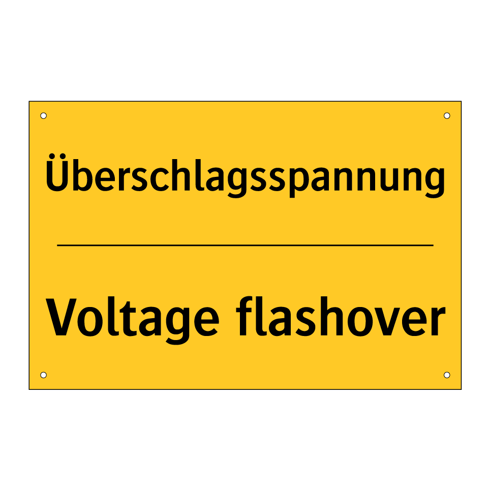 Zweisprachiges Warnschild mit deutschem Text Überschlagsspannung und englischem Text Voltage flashover