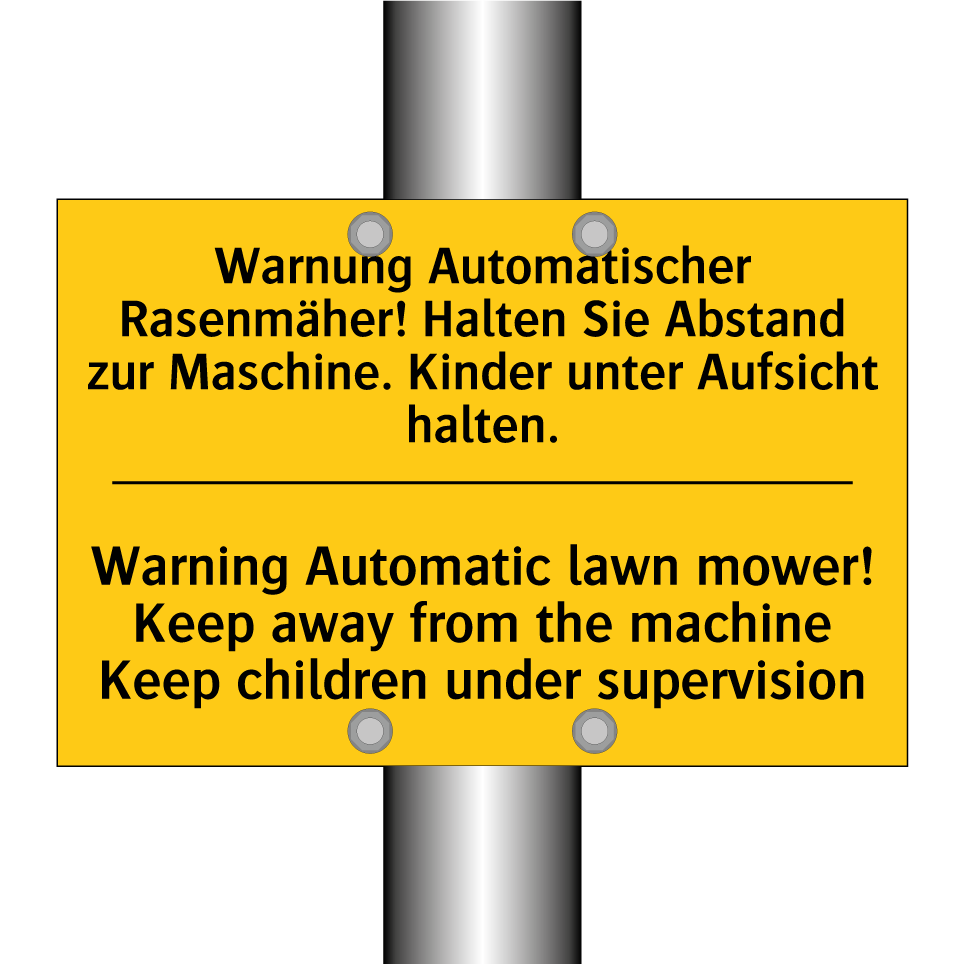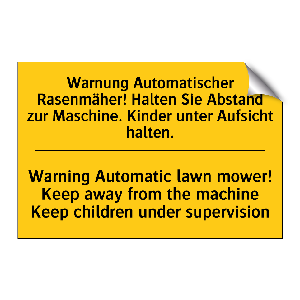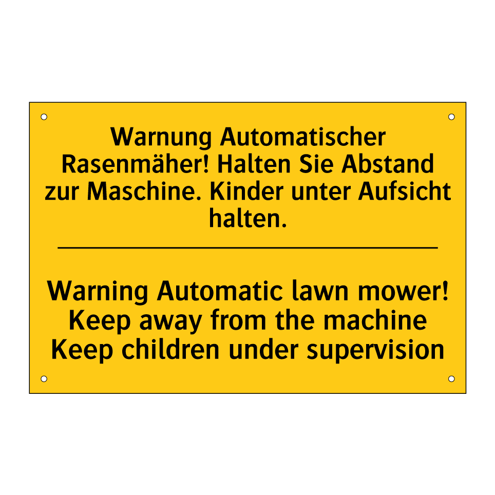 Zweisprachiges Warnschild mit deutschem Text Warnung Automatischer Rasenmäher! Halten Sie Abstand zur Maschine. Kinder unter Aufsicht halten. und englischem Text Warning Automatic lawn mower! Keep away from the machine Keep children under supervision