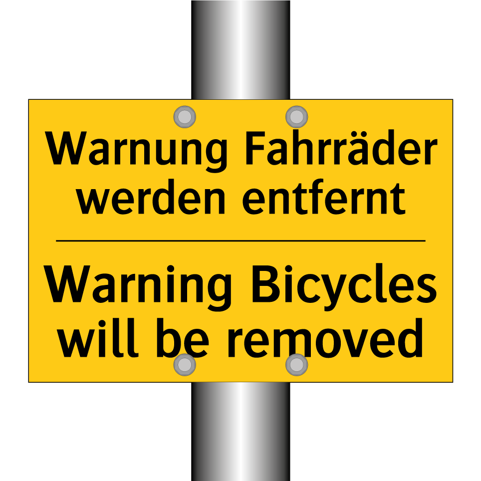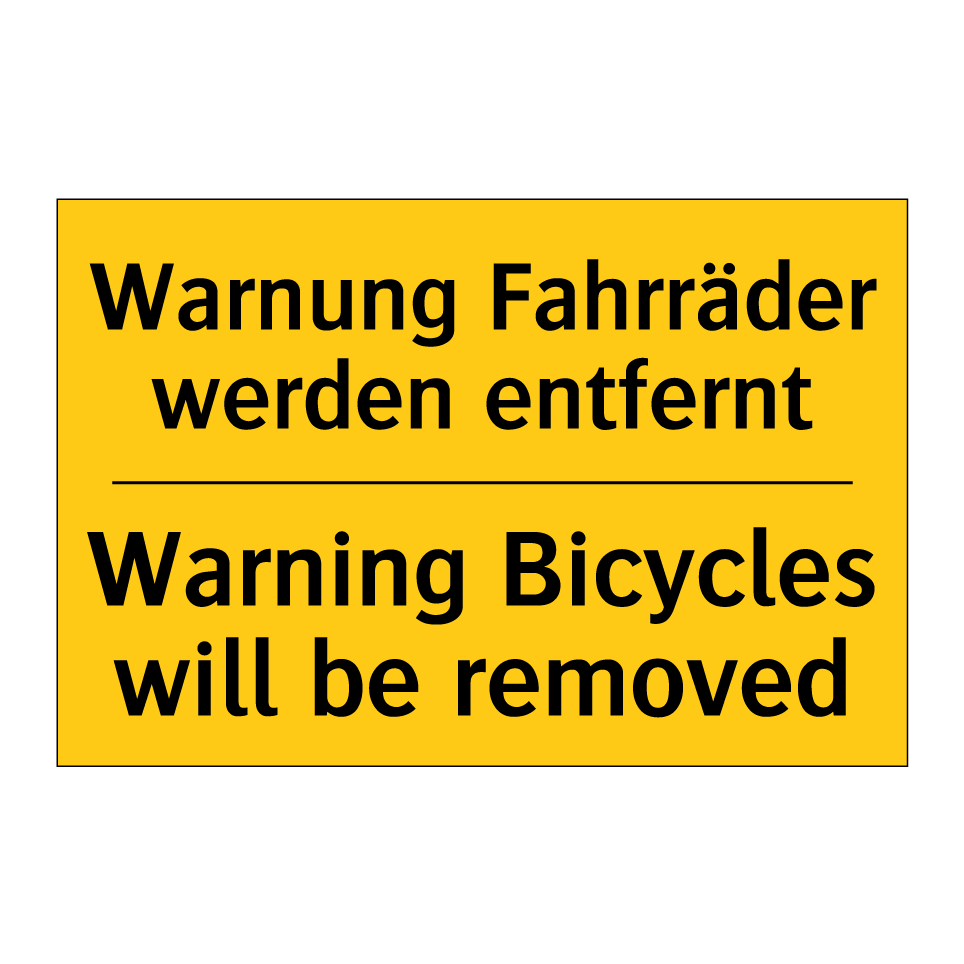 Zweisprachiges Warnschild mit deutschem Text Warnung Fahrräder werden entfernt und englischem Text Warning Bicycles will be removed