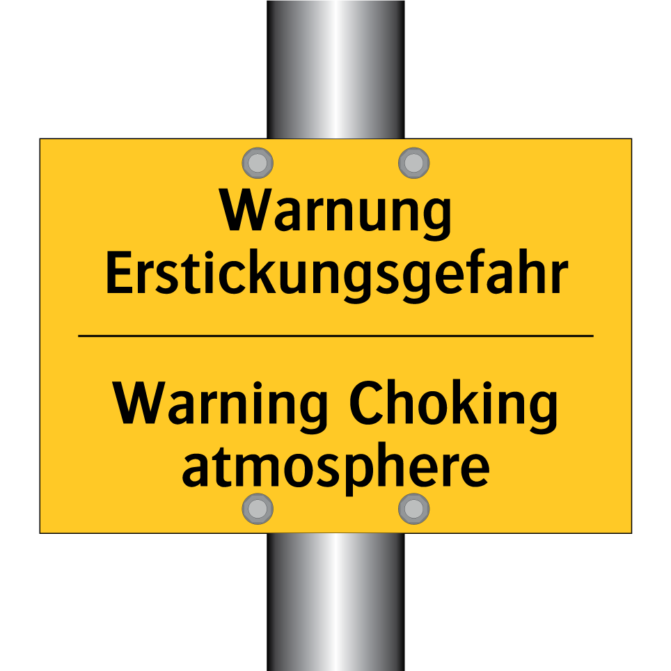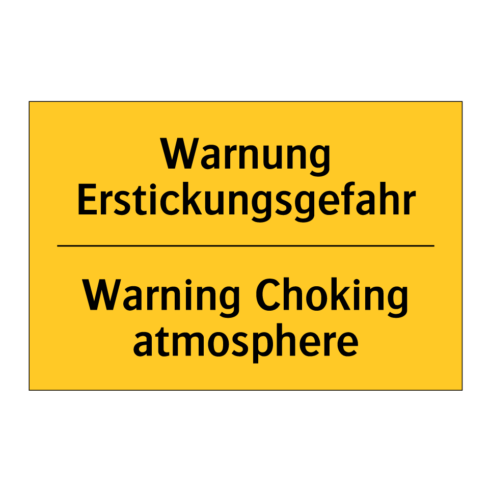 Zweisprachiges Warnschild mit deutschem Text Warnung Erstickungsgefahr und englischem Text Warning Choking atmosphere