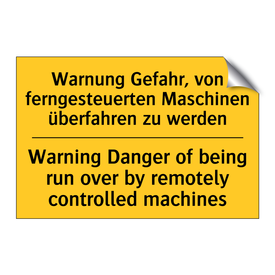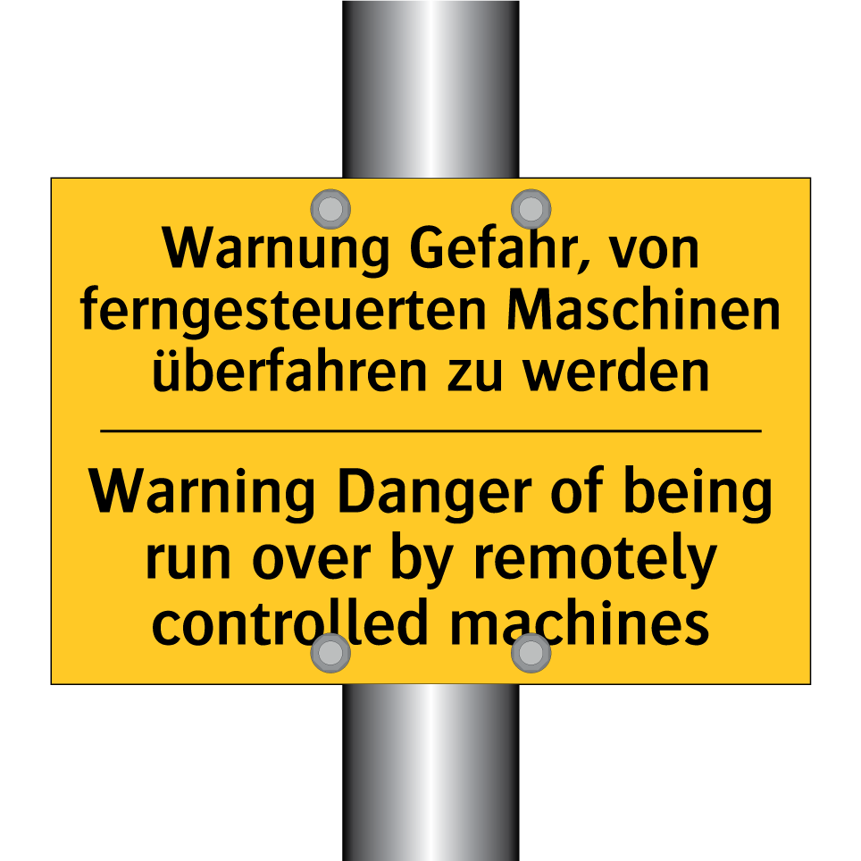 Zweisprachiges Warnschild mit deutschem Text Warnung Gefahr, von ferngesteuerten Maschinen überfahren zu werden und englischem Text Warning Danger of being run over by remotely controlled machines