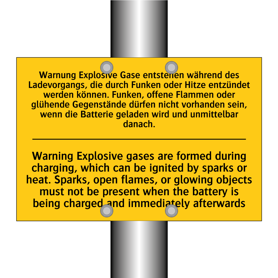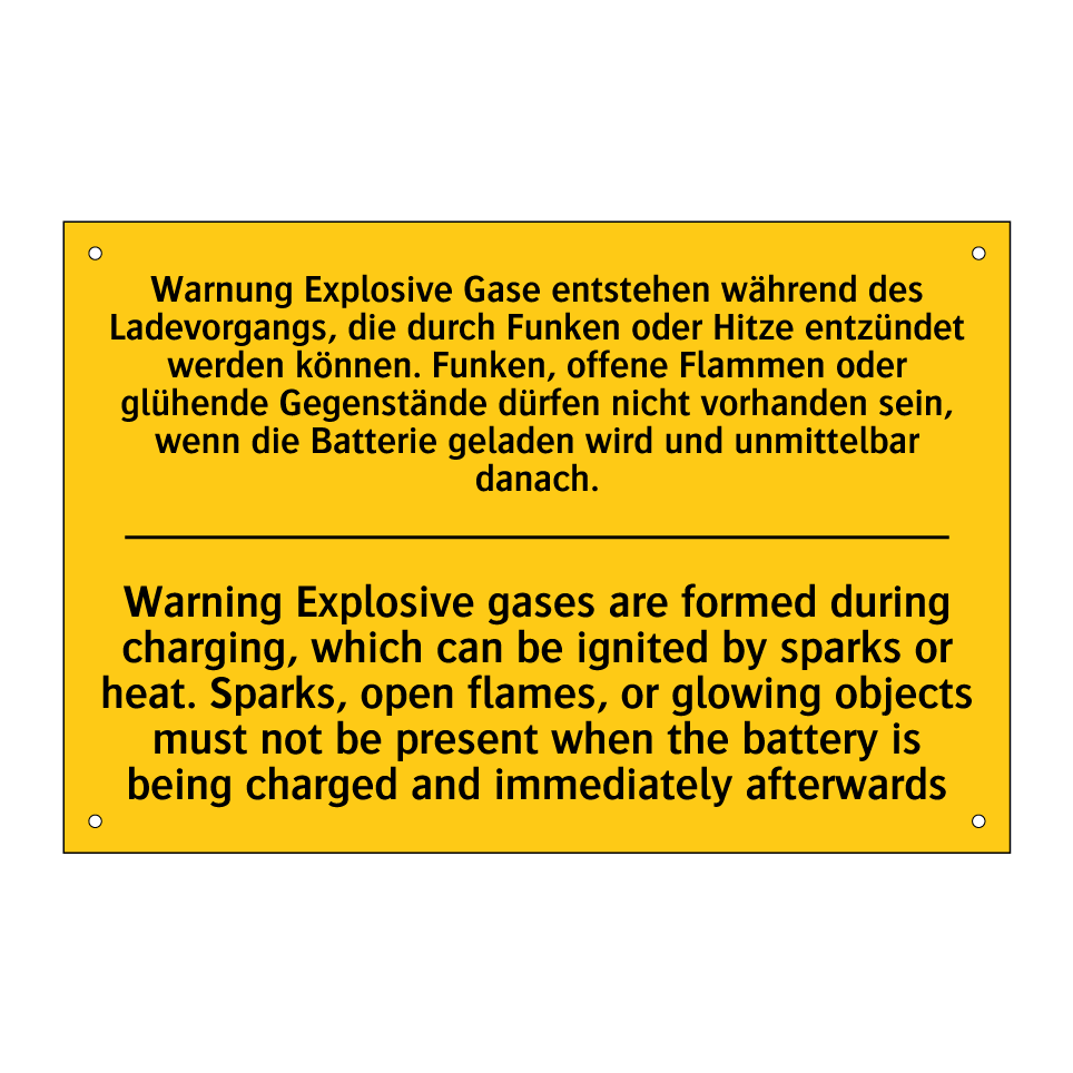 Zweisprachiges Warnschild mit deutschem Text Warnung Explosive Gase entstehen während des Ladevorgangs, die durch Funken oder Hitze entzündet werden können. Funken, offene Flammen oder glühende Gegenstände dürfen nicht vorhanden sein, wenn die Batterie geladen wird und unmittelbar danach. und englischem Text Warning Explosive gases are formed during charging, which can be ignited by sparks or heat. Sparks, open flames, or glowing objects must not be present when the battery is being charged and immediately afterwards