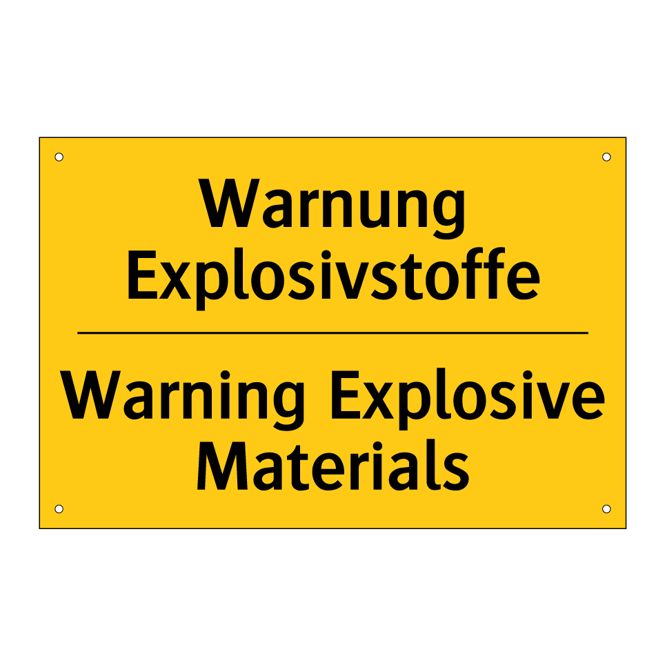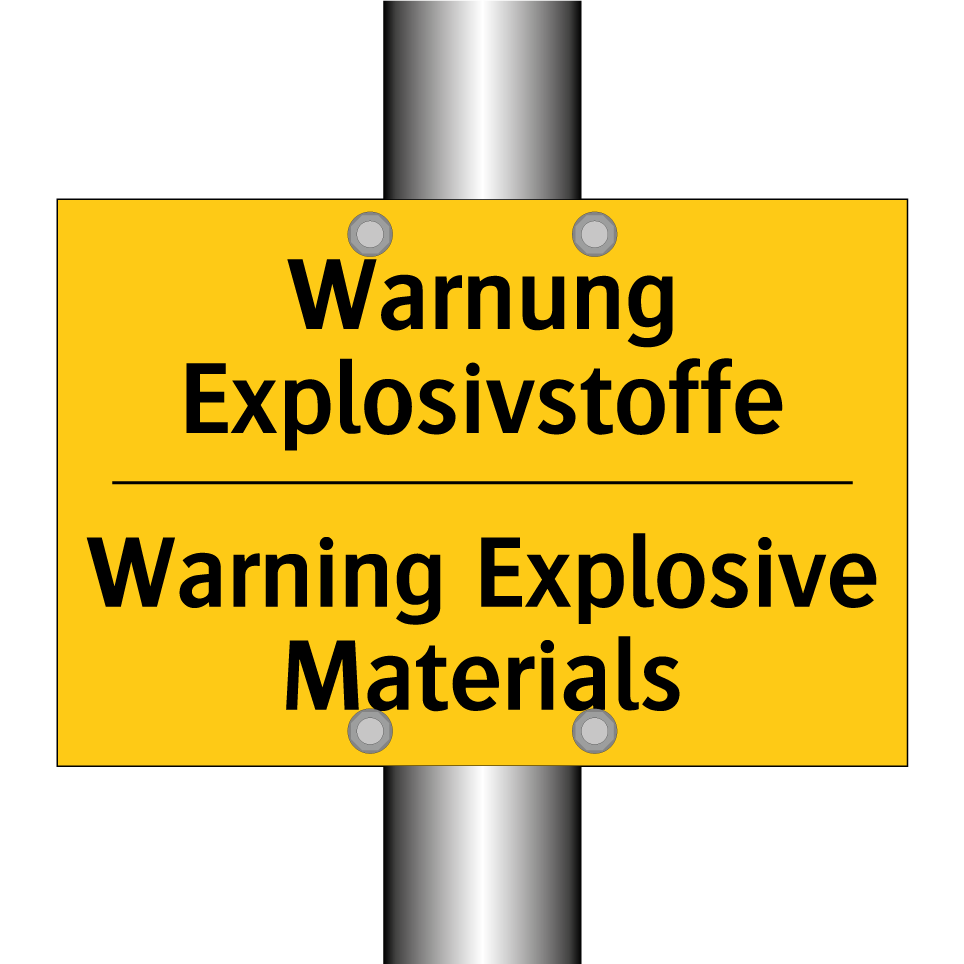 Zweisprachiges Warnschild mit deutschem Text Warnung Explosivstoffe und englischem Text Warning Explosive Materials