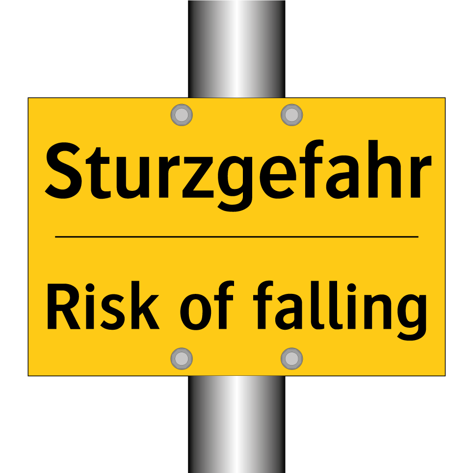 Zweisprachiges Warnschild mit deutschem Text Sturzgefahr und englischem Text Risk of falling