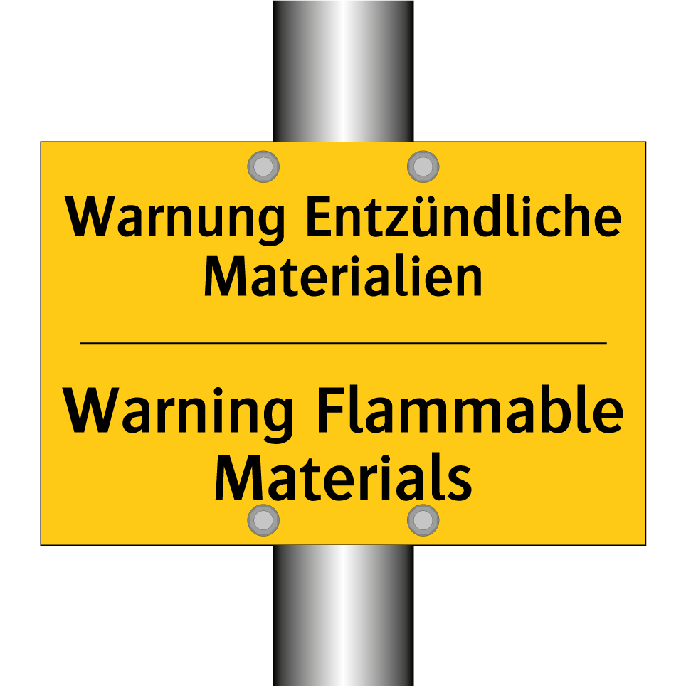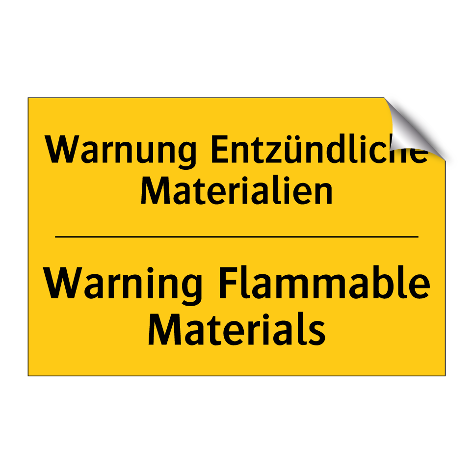 Zweisprachiges Warnschild mit deutschem Text Warnung Entzündliche Materialien und englischem Text Warning Flammable Materials