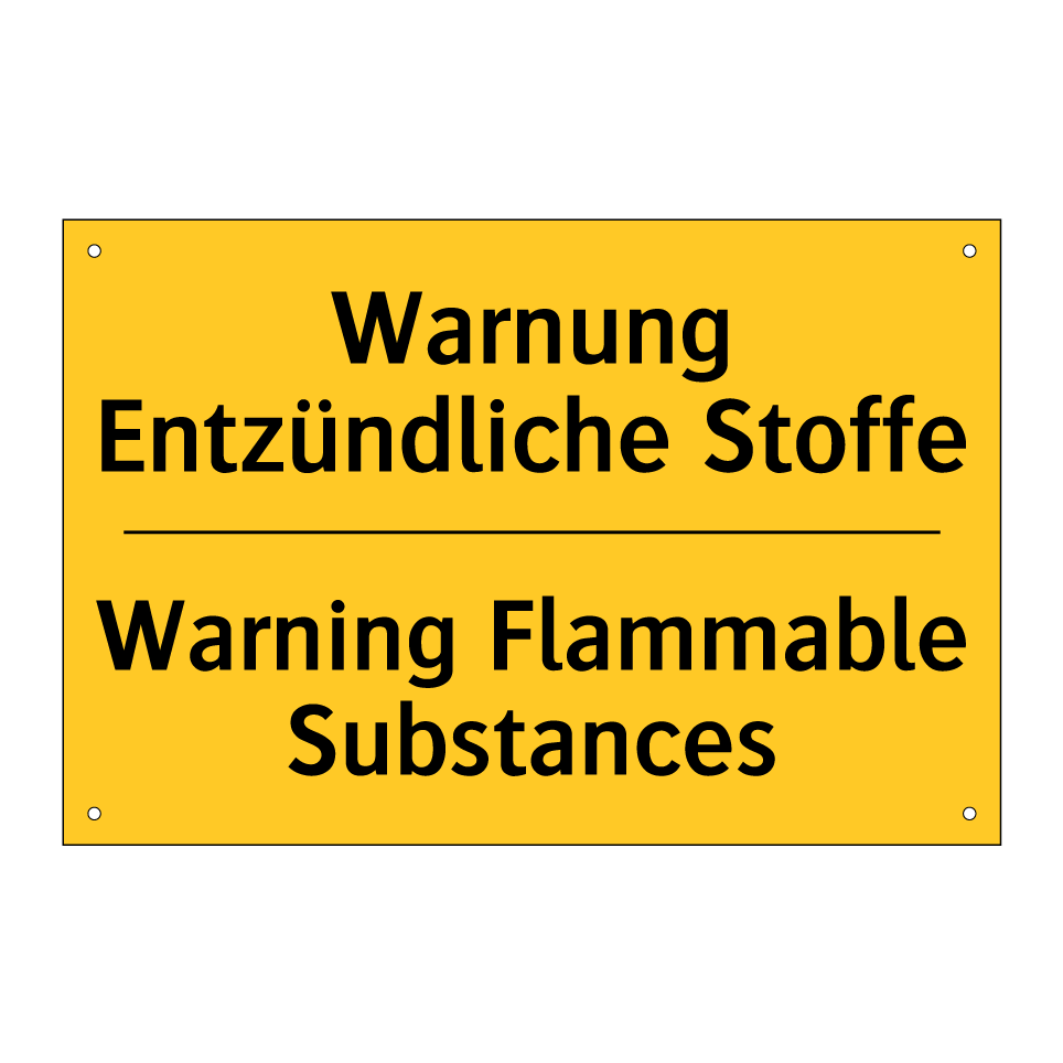 Zweisprachiges Warnschild mit deutschem Text Warnung Entzündliche Stoffe und englischem Text Warning Flammable Substances