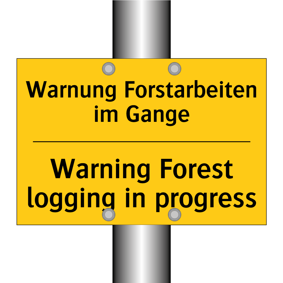 Zweisprachiges Warnschild mit deutschem Text Warnung Forstarbeiten im Gange und englischem Text Warning Forest logging in progress