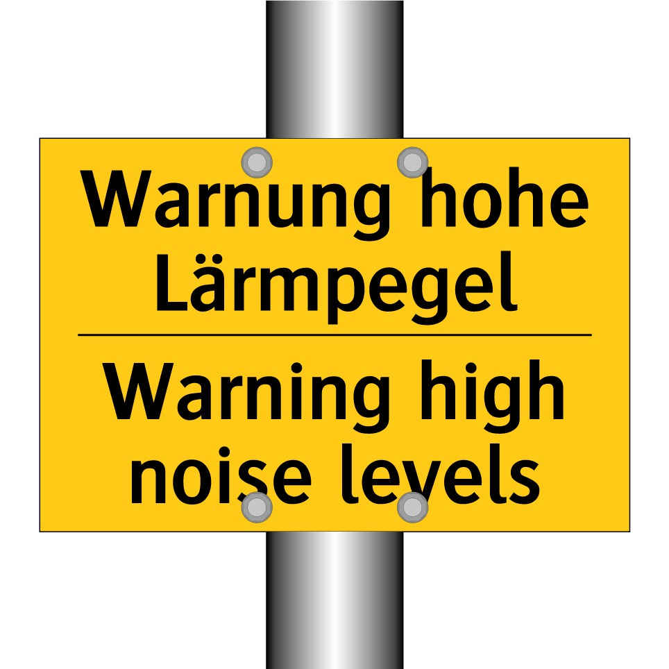 Zweisprachiges Warnschild mit deutschem Text Warnung hohe Lärmpegel und englischem Text Warning high noise levels