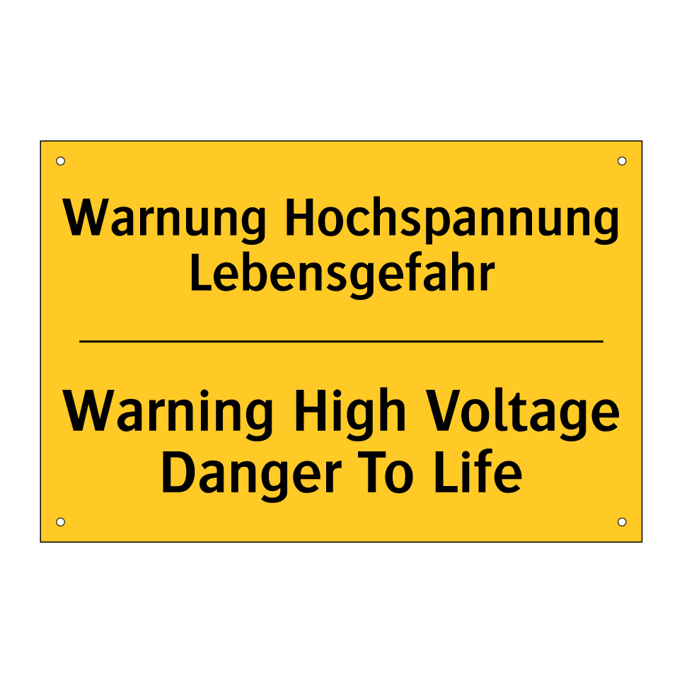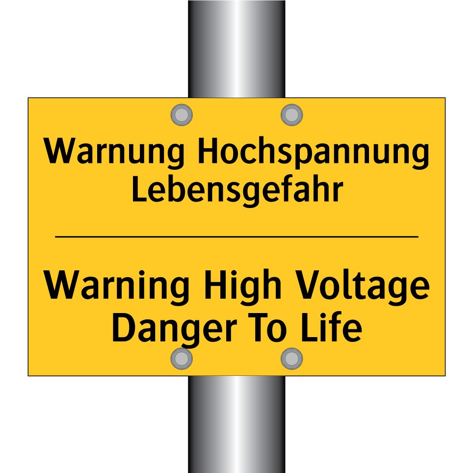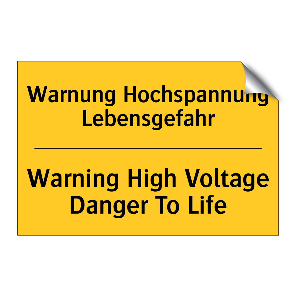Zweisprachiges Warnschild mit deutschem Text Warnung Hochspannung Lebensgefahr und englischem Text Warning High Voltage Danger To Life