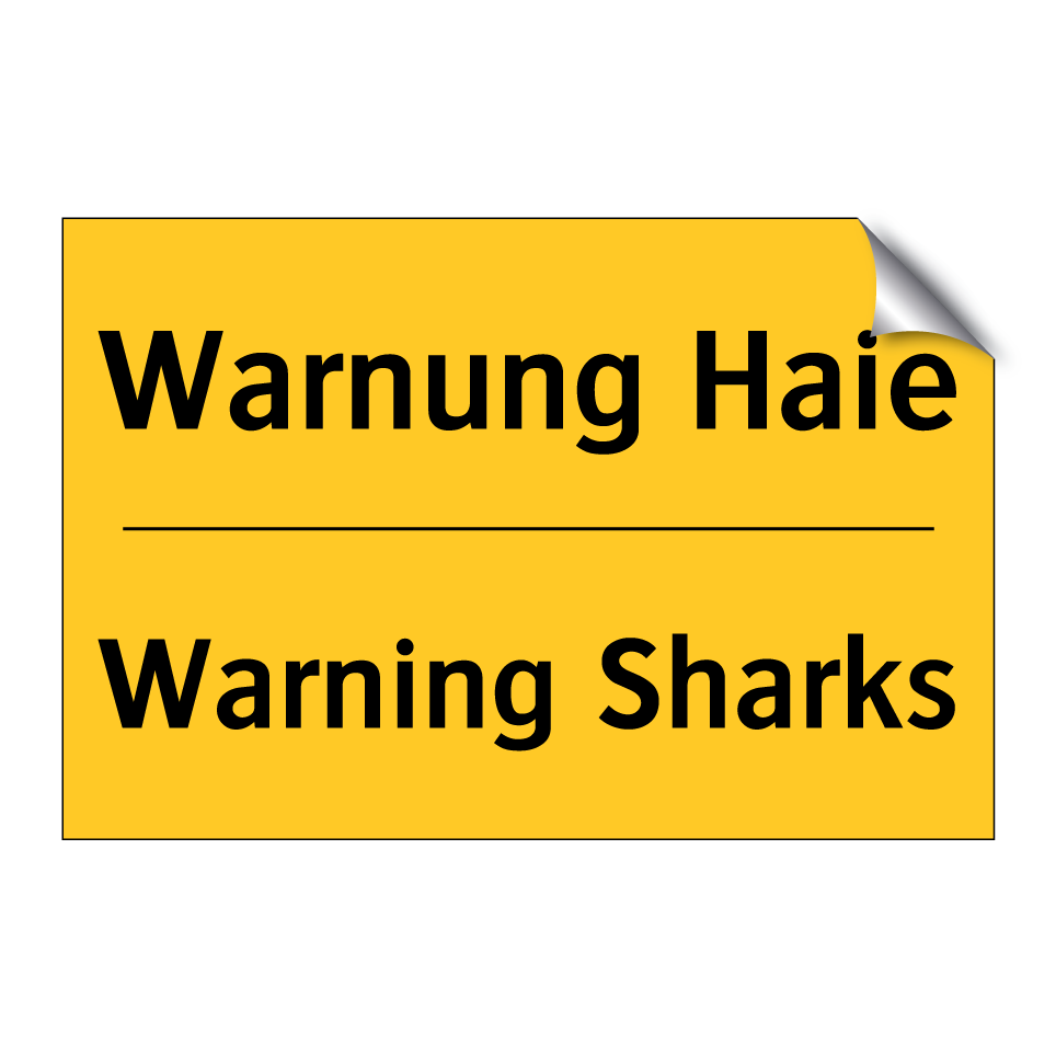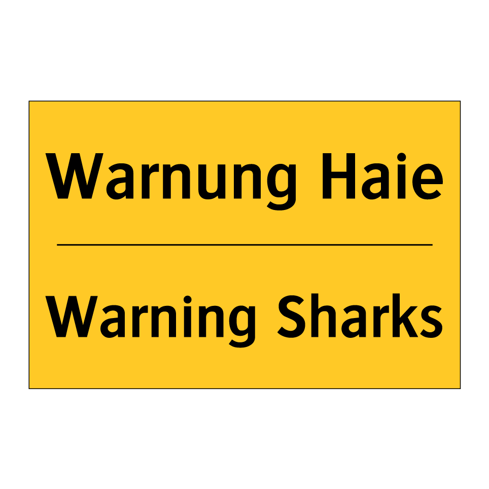 Zweisprachiges Warnschild mit deutschem Text Warnung Haie und englischem Text Warning Sharks