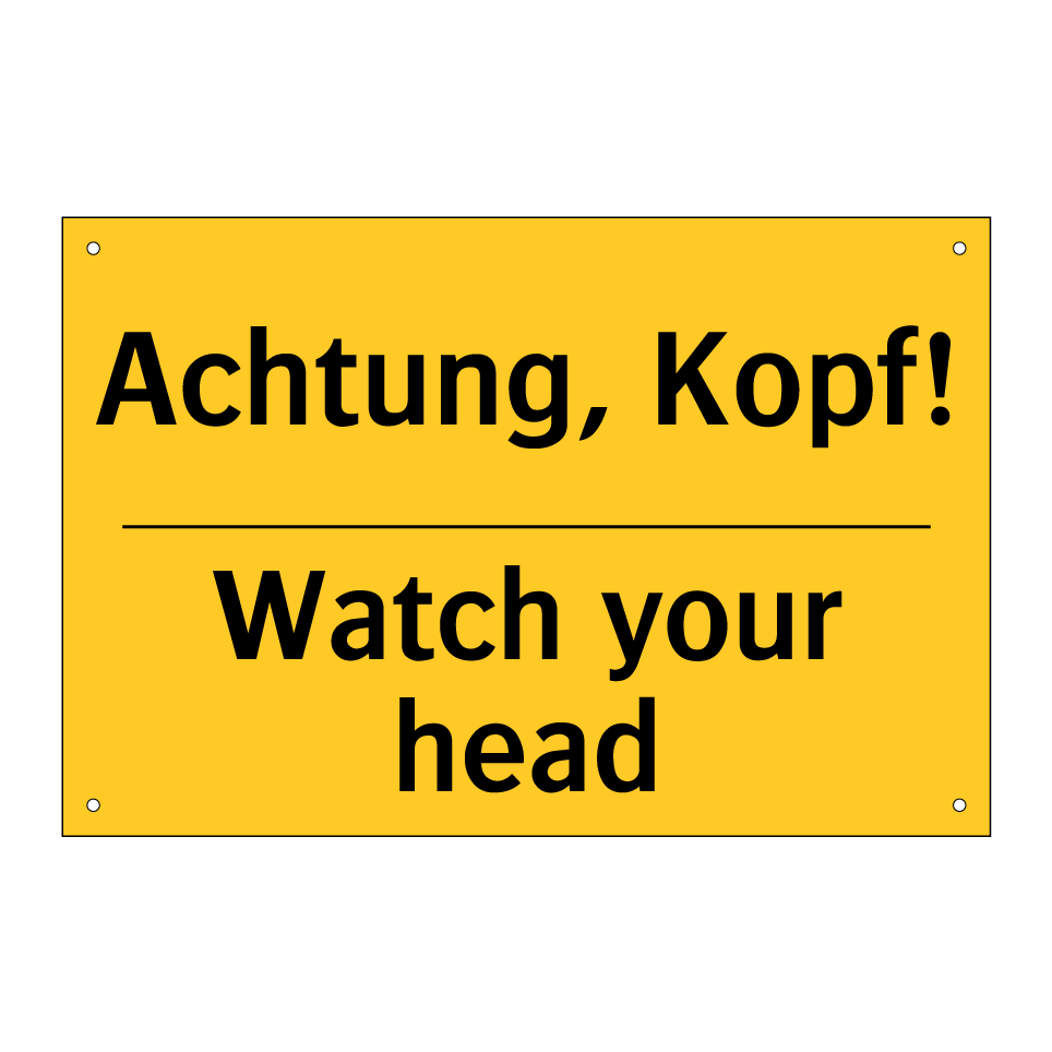 Zweisprachiges Warnschild mit deutschem Text Achtung, Kopf! und englischem Text Watch your head