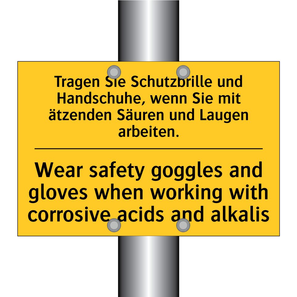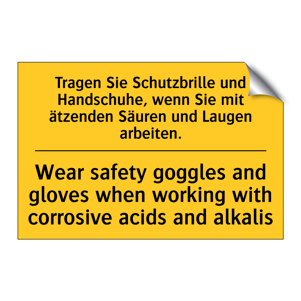 Zweisprachiges Warnschild mit deutschem Text Tragen Sie Schutzbrille und Handschuhe, wenn Sie mit ätzenden Säuren und Laugen arbeiten. und englischem Text Wear safety goggles and gloves when working with corrosive acids and alkalis