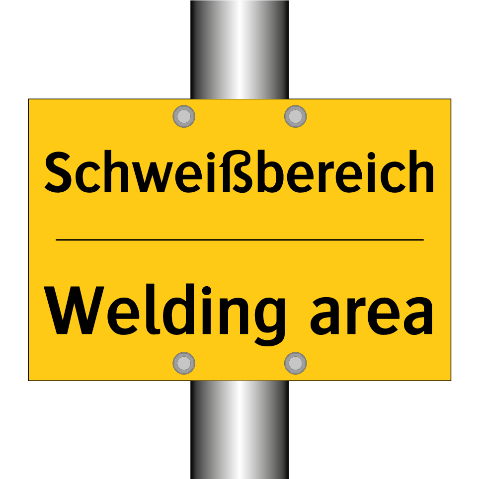 Zweisprachiges Warnschild mit deutschem Text Schweißbereich und englischem Text Welding area