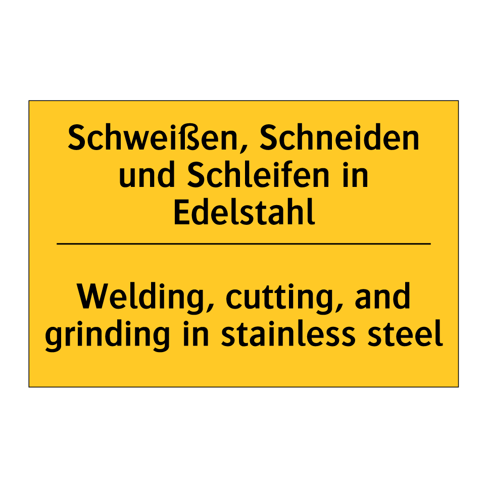 Zweisprachiges Warnschild mit deutschem Text Schweißen, Schneiden und Schleifen in Edelstahl und englischem Text Welding, cutting, and grinding in stainless steel
