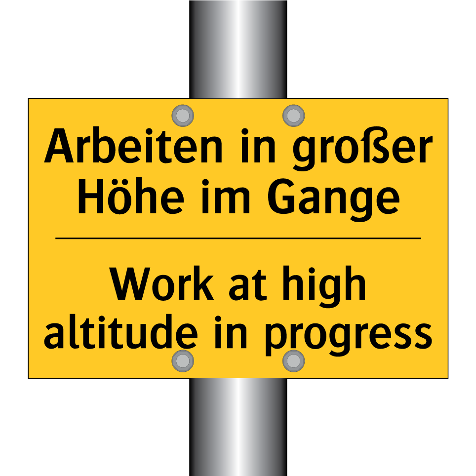 Zweisprachiges Warnschild mit deutschem Text Arbeiten in großer Höhe im Gange und englischem Text Work at high altitude in progress