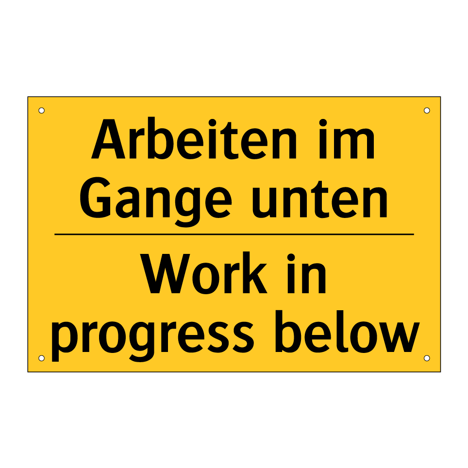 Zweisprachiges Warnschild mit deutschem Text Arbeiten im Gange unten und englischem Text Work in progress below