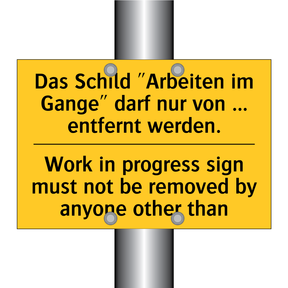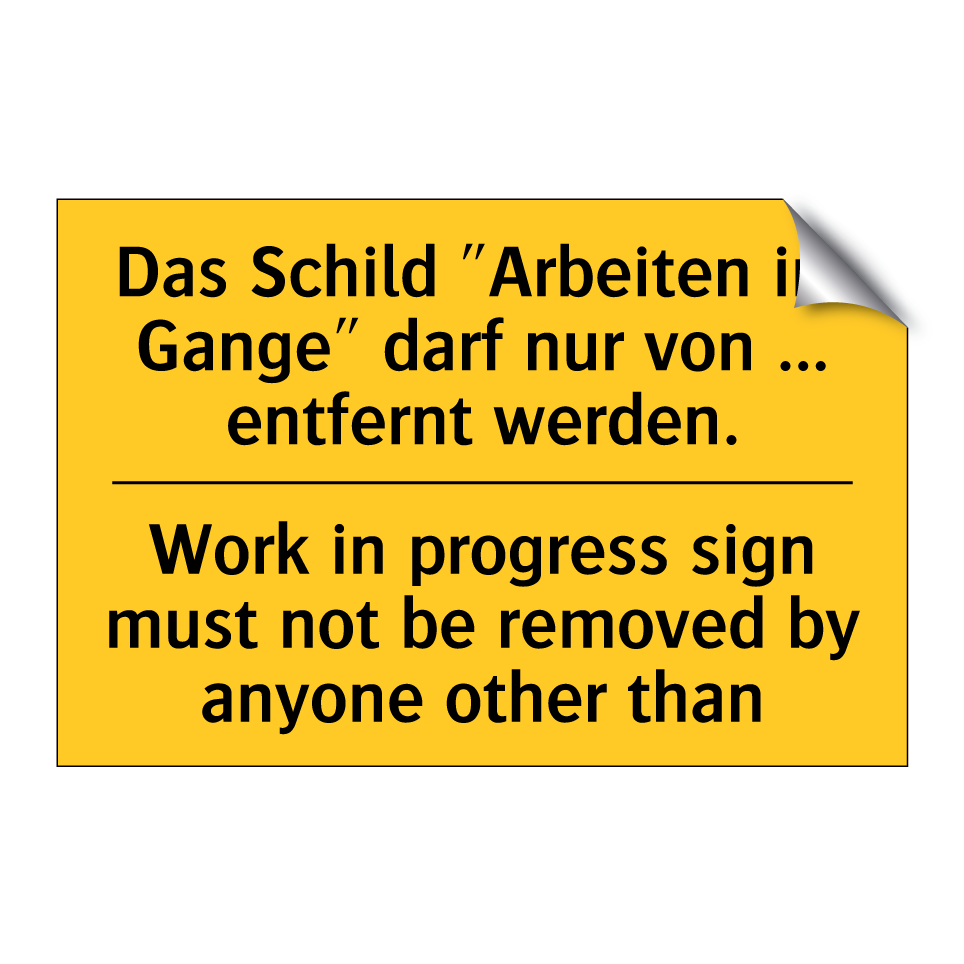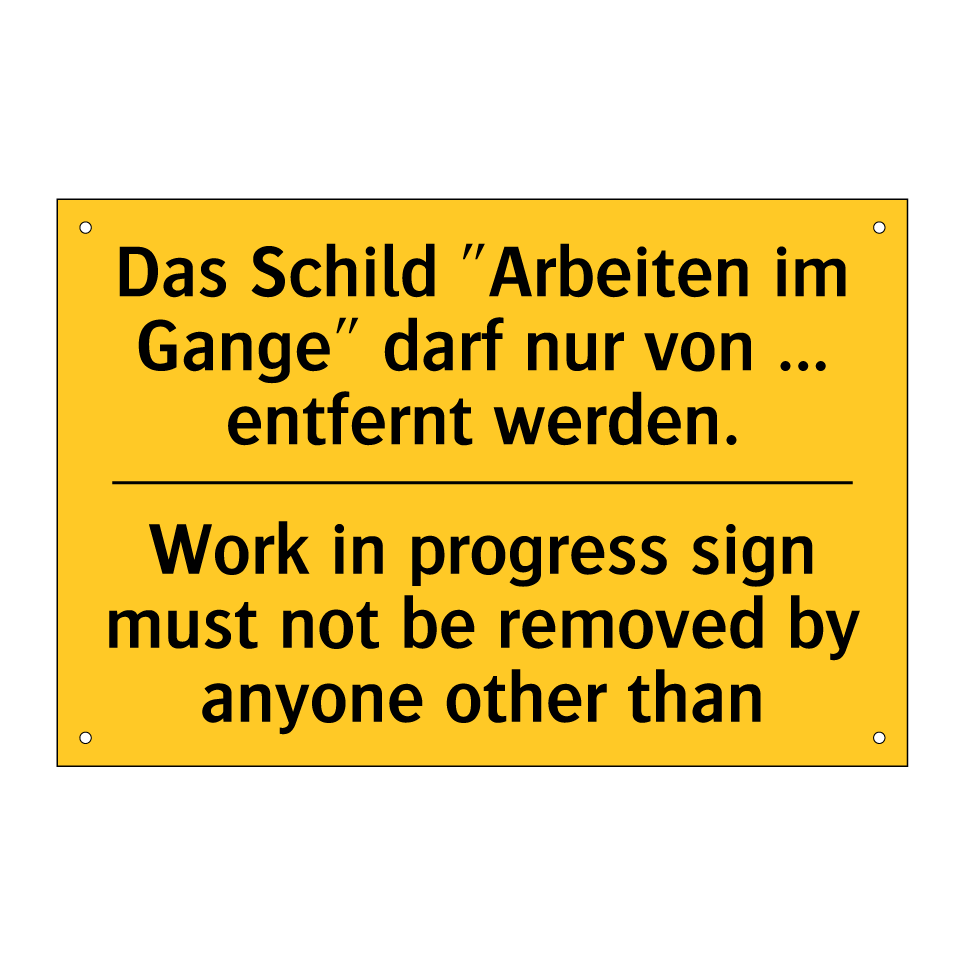 Zweisprachiges Warnschild mit deutschem Text Das Schild "Arbeiten im Gange" darf nur von ... entfernt werden. und englischem Text Work in progress sign must not be removed by anyone other than