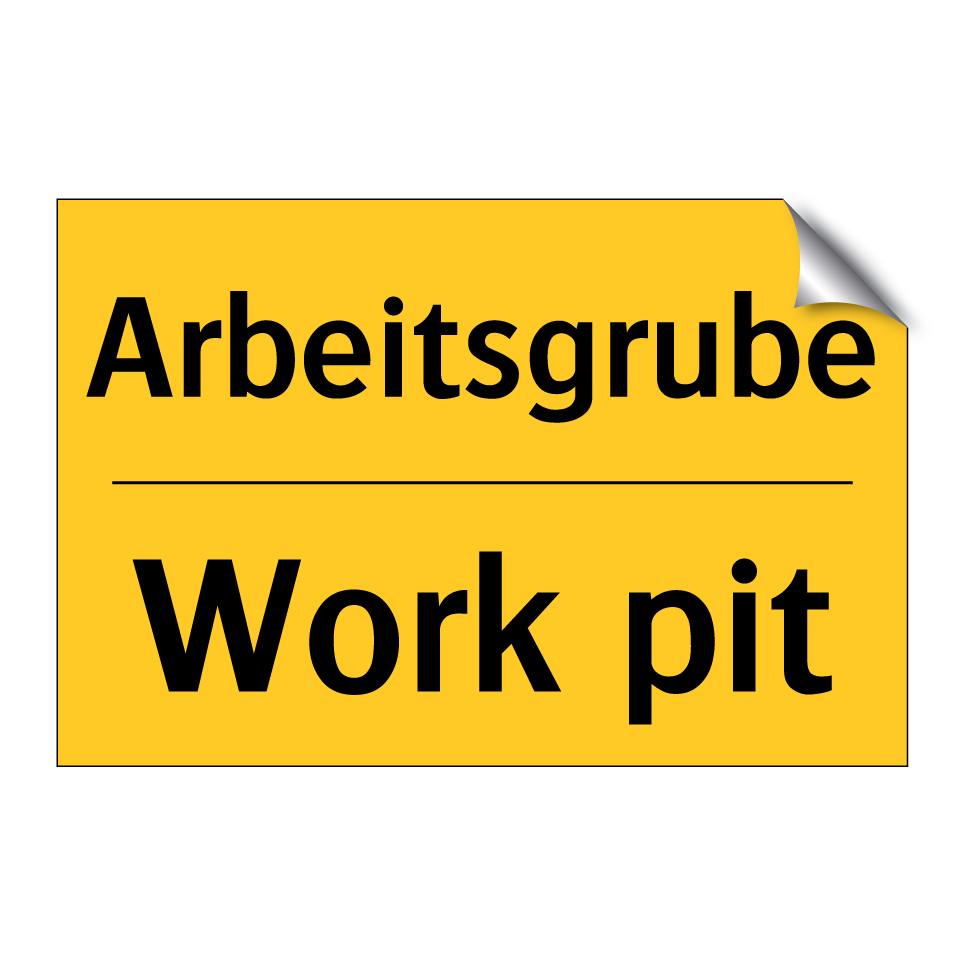 Zweisprachiges Warnschild mit deutschem Text Arbeitsgrube und englischem Text Work pit