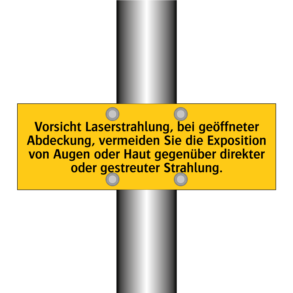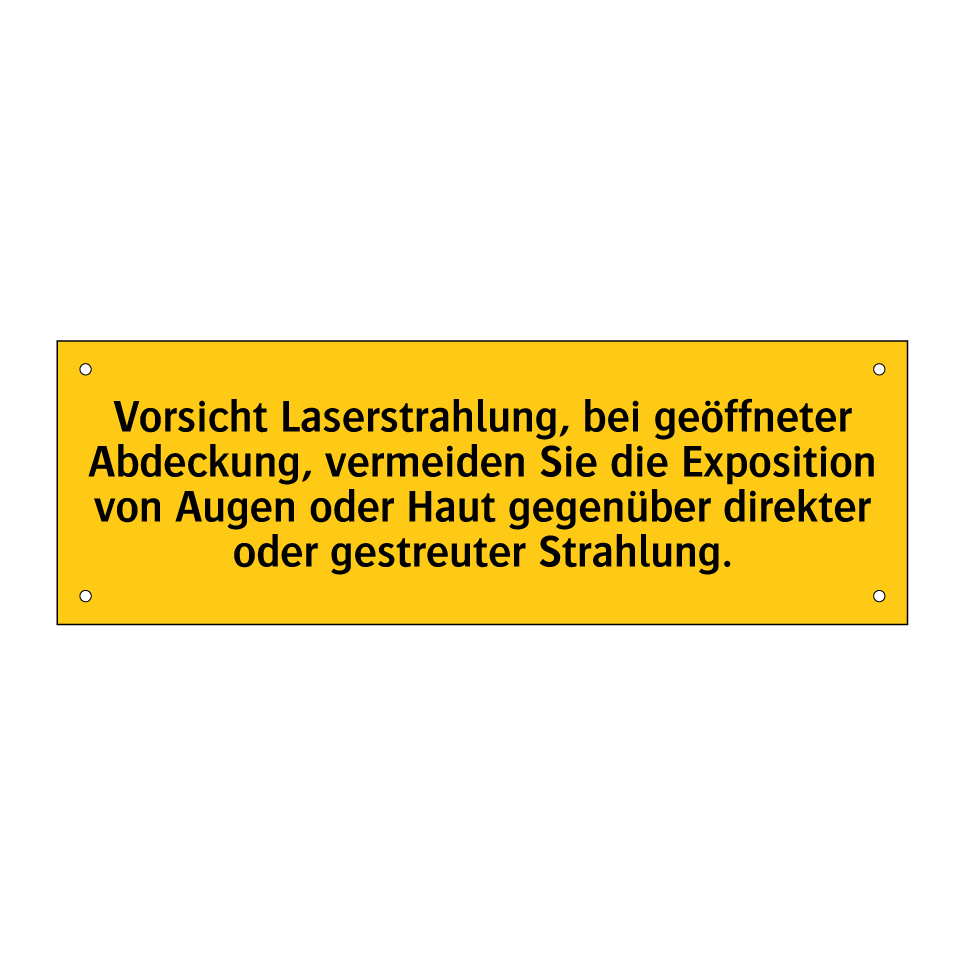 Warnschild mit dem Text Vorsicht Laserstrahlung, bei geöffneter Abdeckung, vermeiden Sie die Exposition von Augen oder Haut gegenüber direkter oder gestreuter Strahlung.