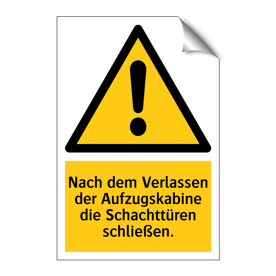 Warnschild mit dem Text Nach dem Verlassen der Aufzugskabine die Schachttüren schließen.