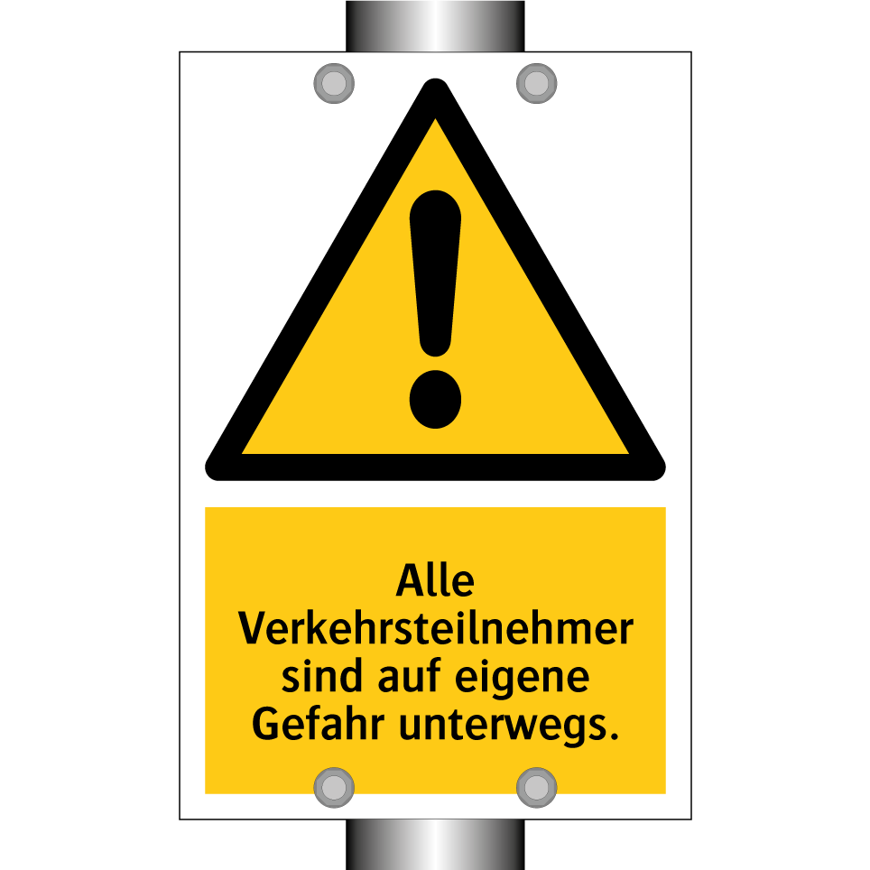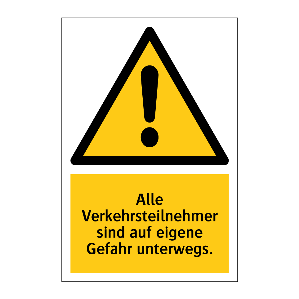 Warnschild mit dem Text Alle Verkehrsteilnehmer sind auf eigene Gefahr unterwegs.