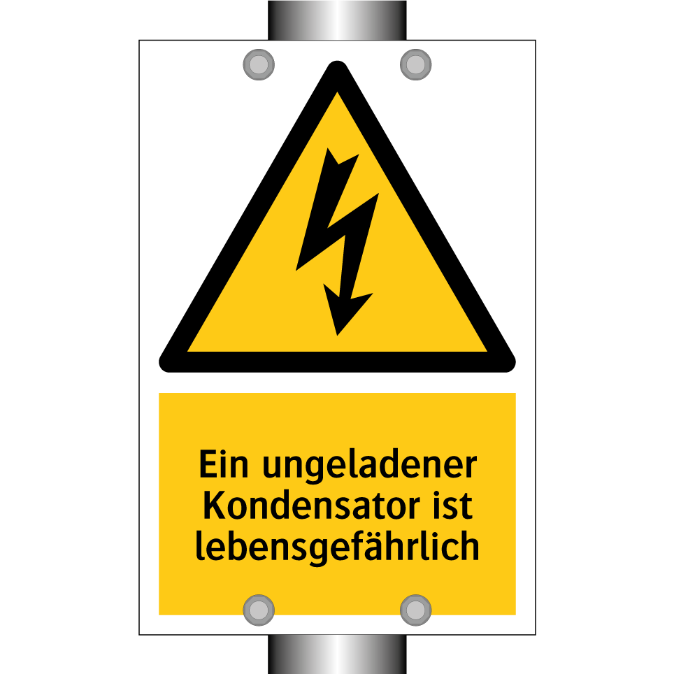 Warnschild mit dem Text Ein ungeladener Kondensator ist lebensgefährlich