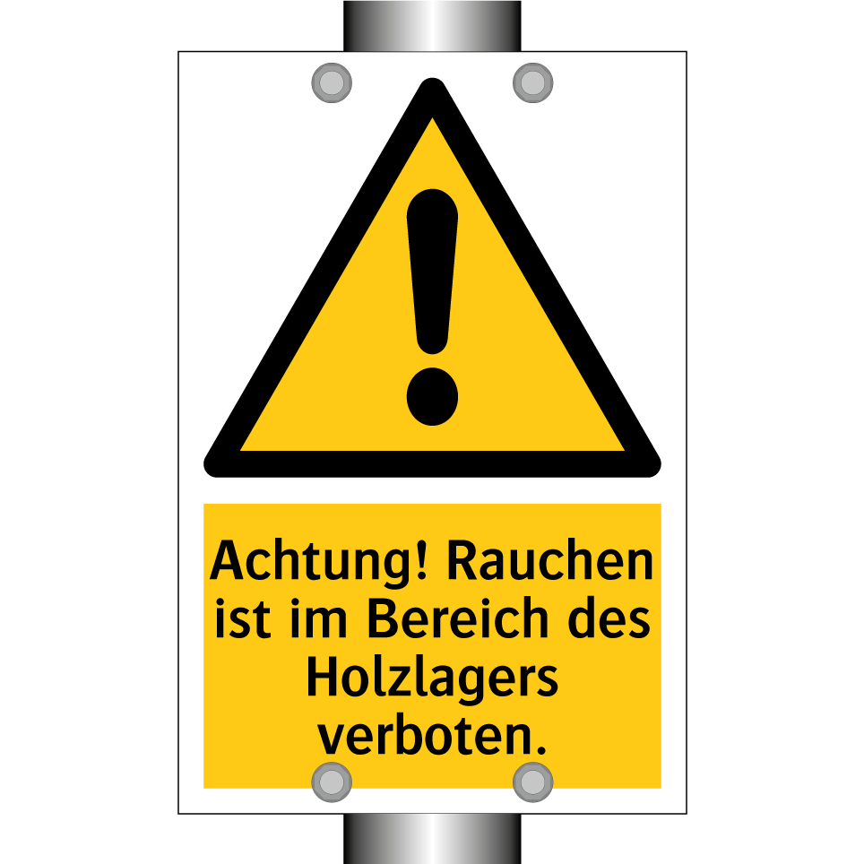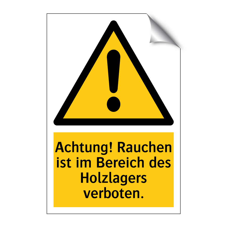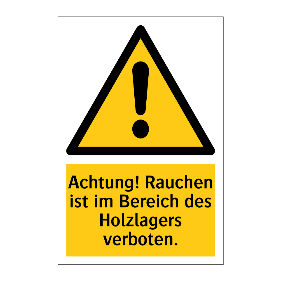 Warnschild mit dem Text Achtung! Rauchen ist im Bereich des Holzlagers verboten.