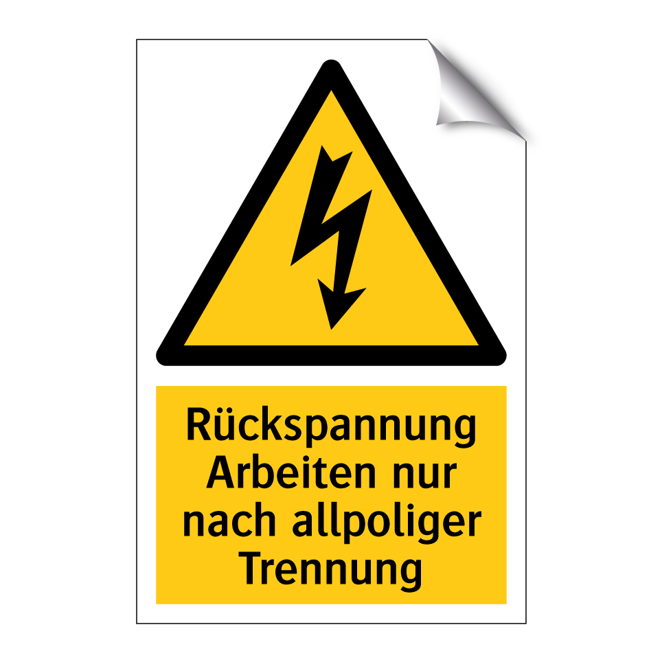 Warnschild mit dem Text Rückspannung Arbeiten nur nach allpoliger Trennung