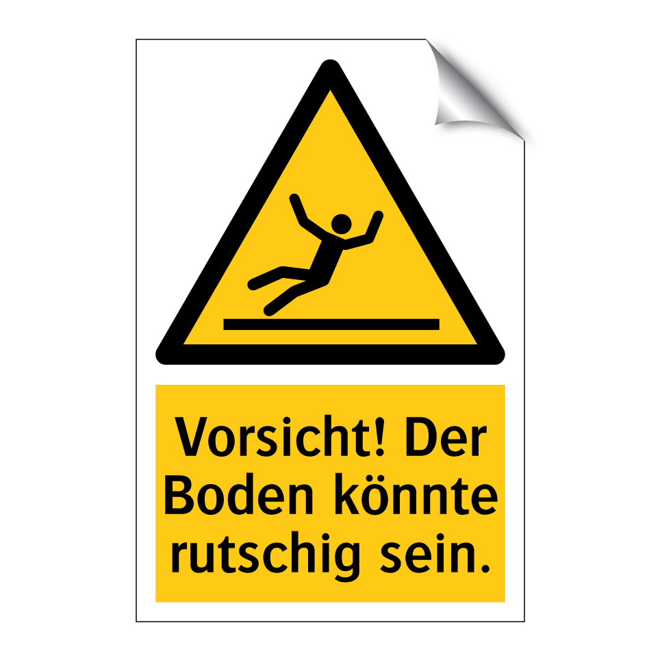 Warnschild mit dem Text Vorsicht! Der Boden könnte rutschig sein.