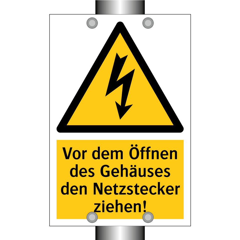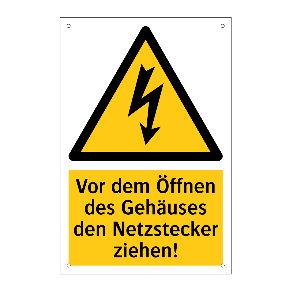 Warnschild mit dem Text Vor dem Öffnen des Gehäuses den Netzstecker ziehen!