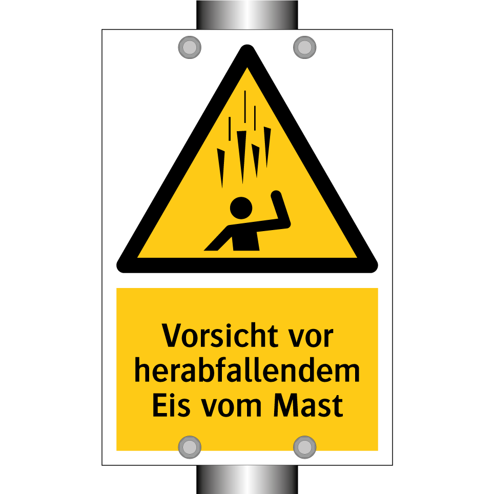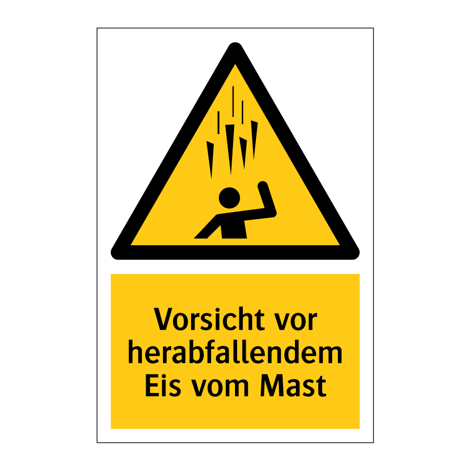 Warnschild mit dem Text Vorsicht vor herabfallendem Eis vom Mast