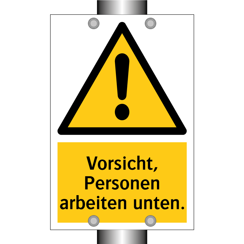 Warnschild mit dem Text Vorsicht, Personen arbeiten unten.