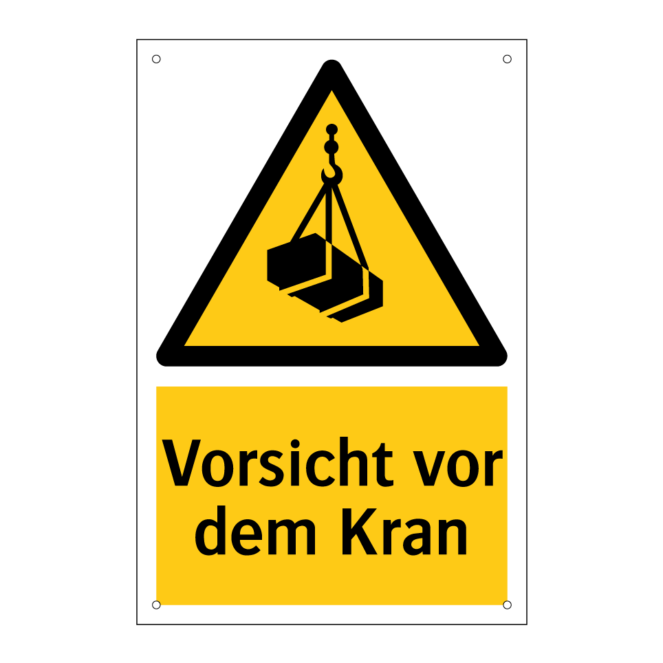 Warnschild mit dem Text Vorsicht vor dem Kran