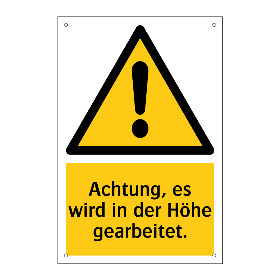 Warnschild mit dem Text Achtung, es wird in der Höhe gearbeitet.