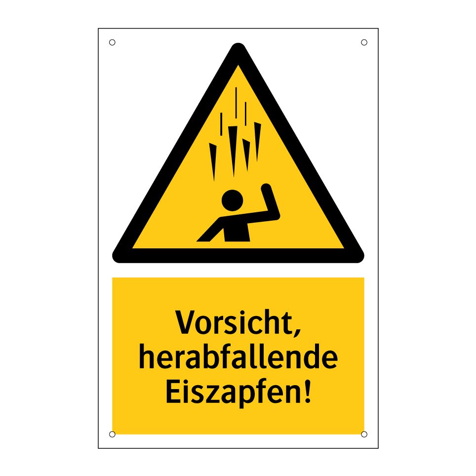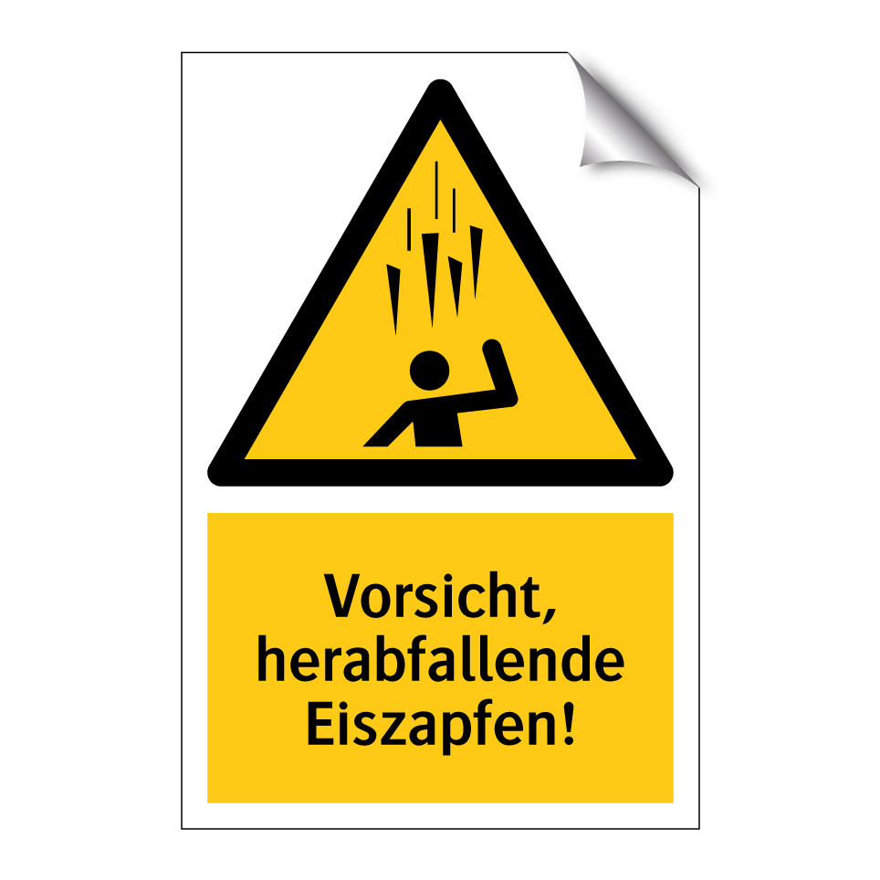 Warnschild mit dem Text Vorsicht, herabfallende Eiszapfen!