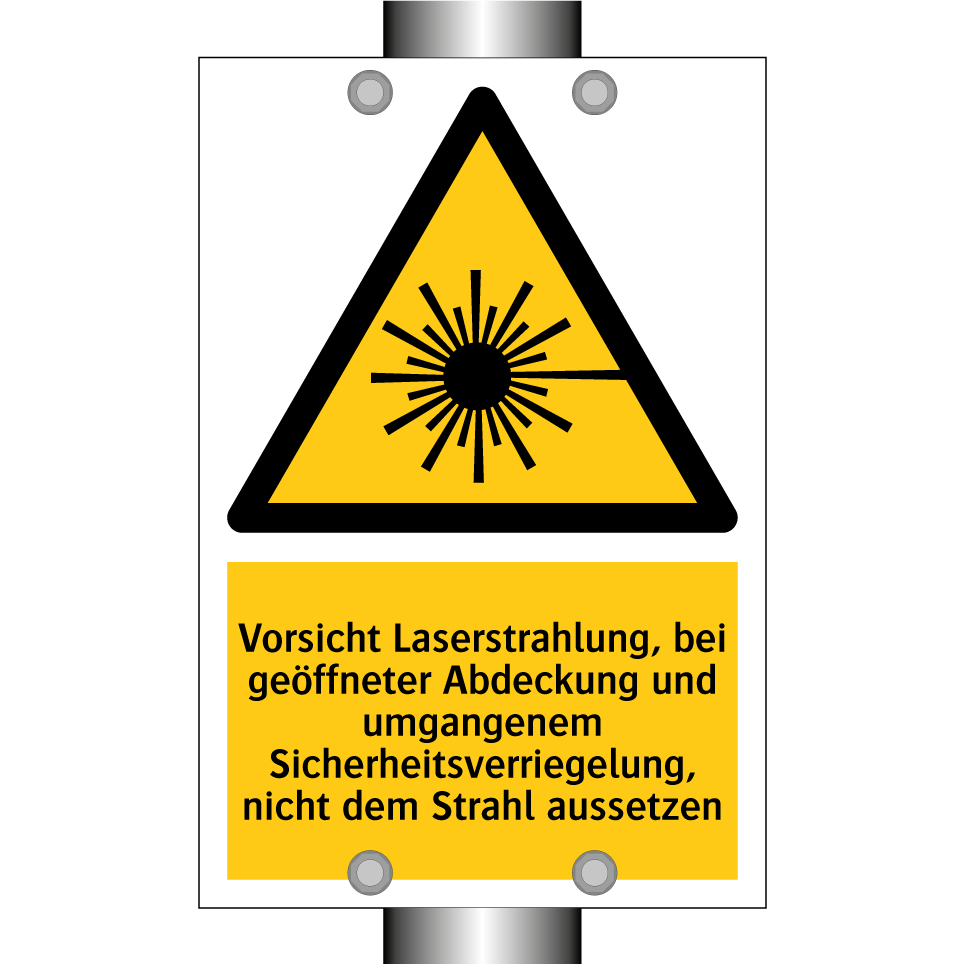Warnschild mit dem Text Vorsicht Laserstrahlung, bei geöffneter Abdeckung und umgangenem Sicherheitsverriegelung, nicht dem Strahl aussetzen