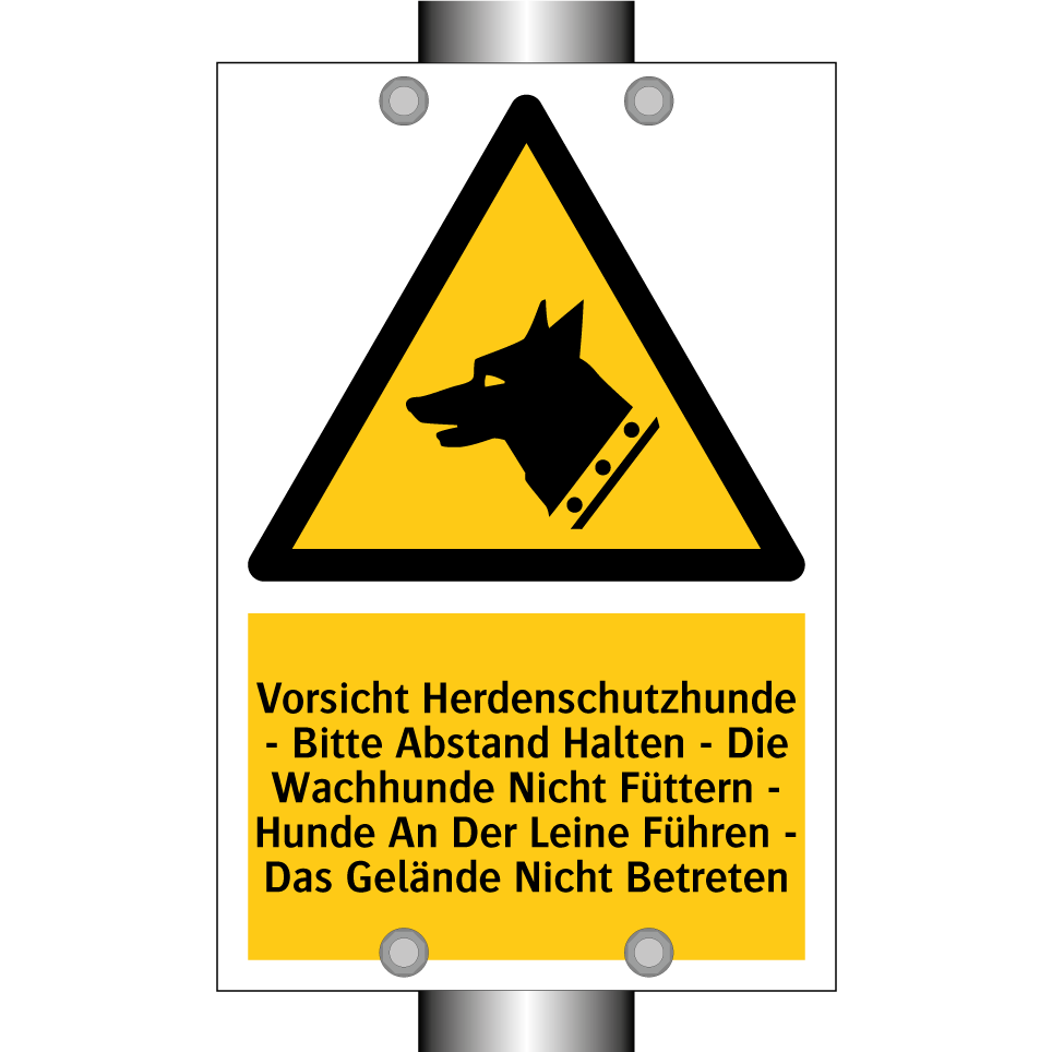 Warnschild mit dem Text Vorsicht Herdenschutzhunde - Bitte Abstand Halten - Die Wachhunde Nicht Füttern - Hunde An Der Leine Führen - Das Gelände Nicht Betreten